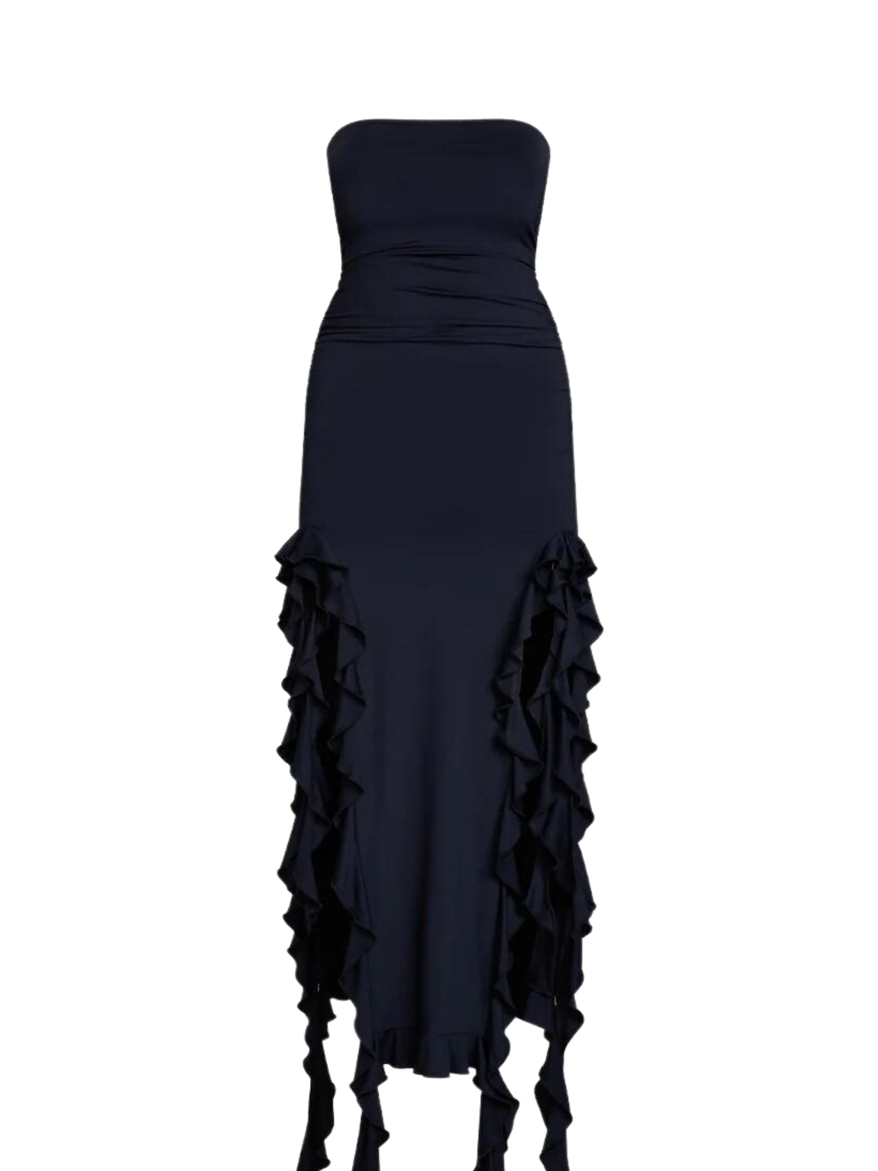Be fun + stylishly elegant in our Lisa Strapless Ruffle Dress! With a strapless fit. asymmetric ruffle skirt. and figure-hugging bodycon fit. this good-girl dress will have you feeling flirty and ready for date night! Date smarter. not harder with our Date Night Collection!