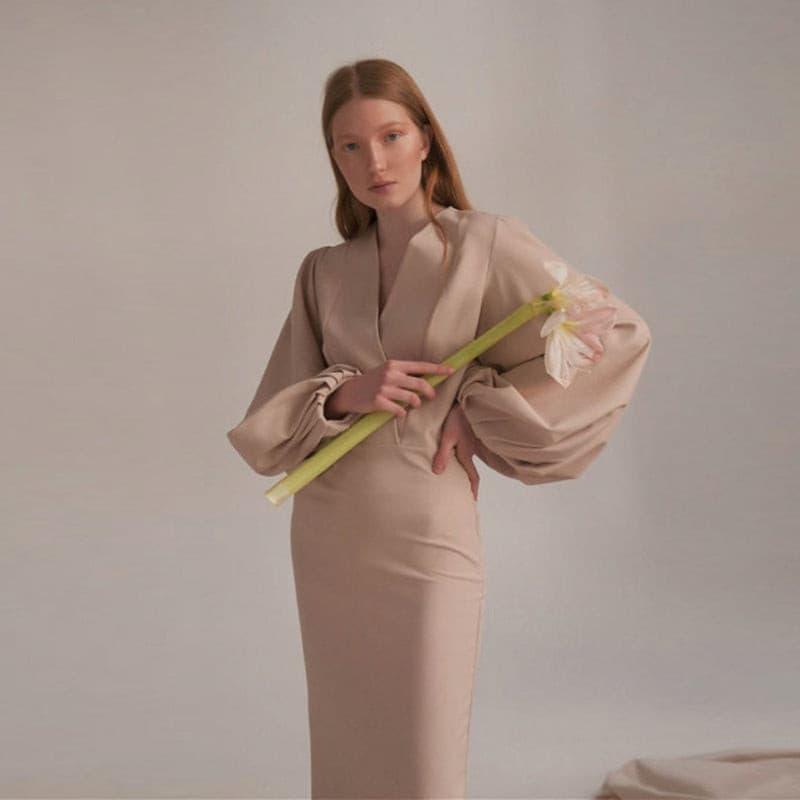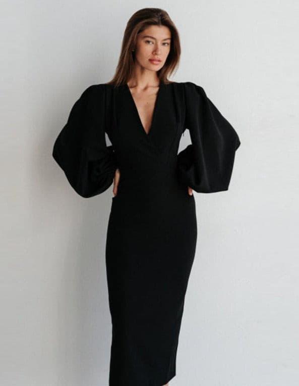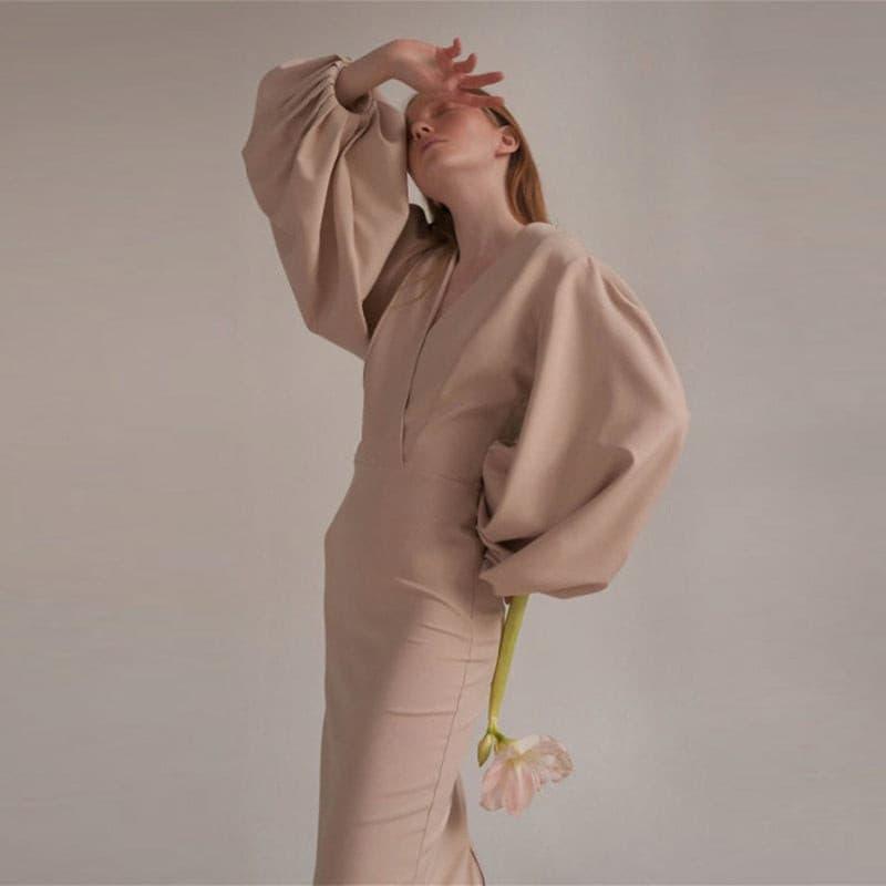 Long sexy deep V-neck lantern sleeve hip dress