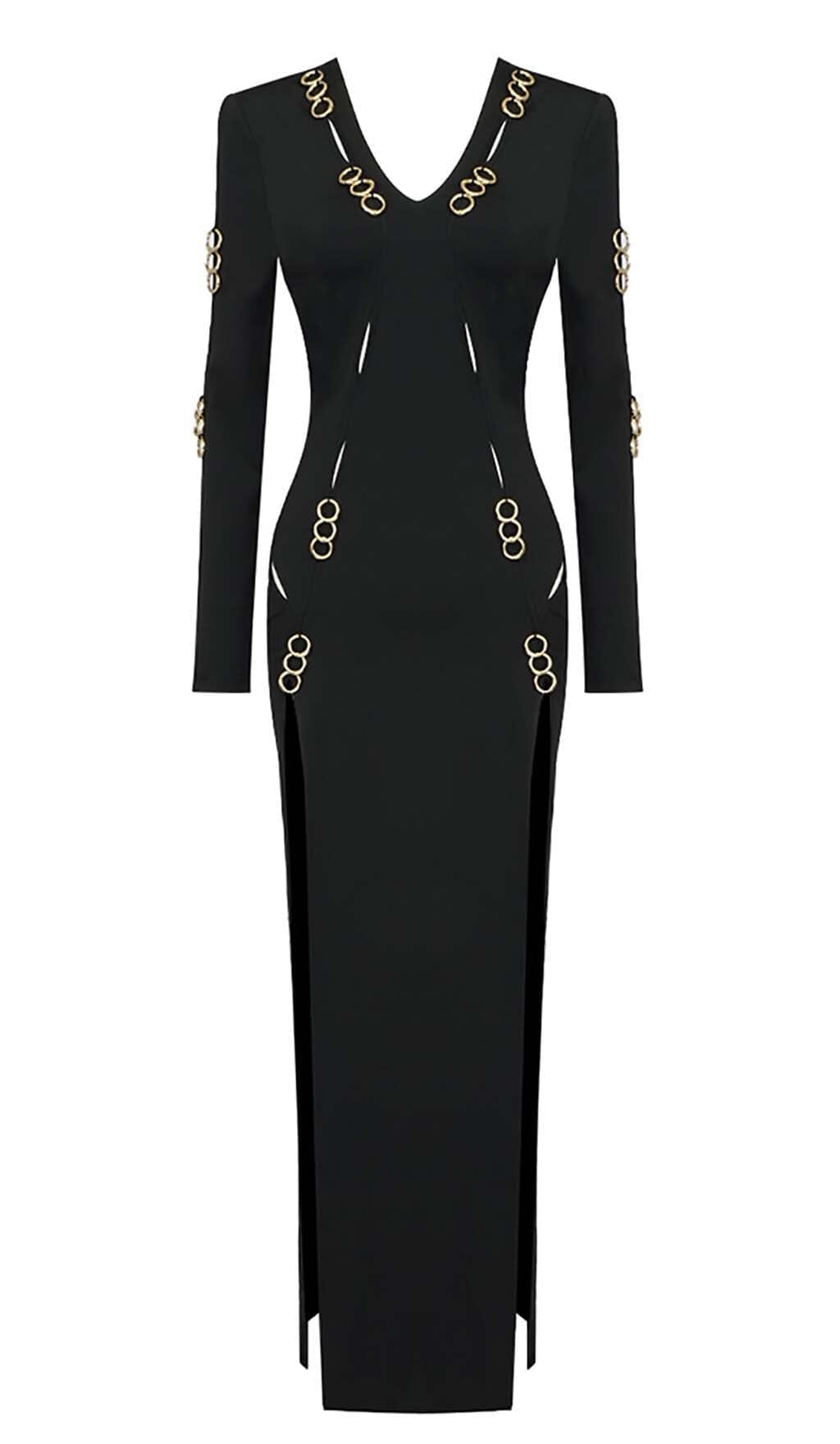 LONG SLEEVE EMBELLISHED MAXI DRESS IN BLACK