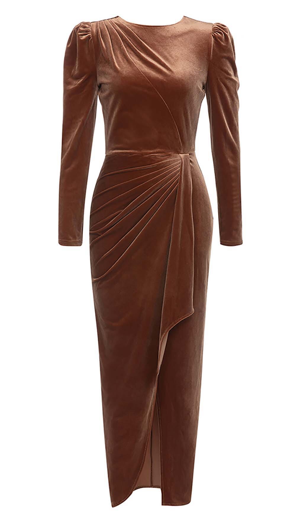 LONG SLEEVE VELVET MIDI DRESS IN BROWN