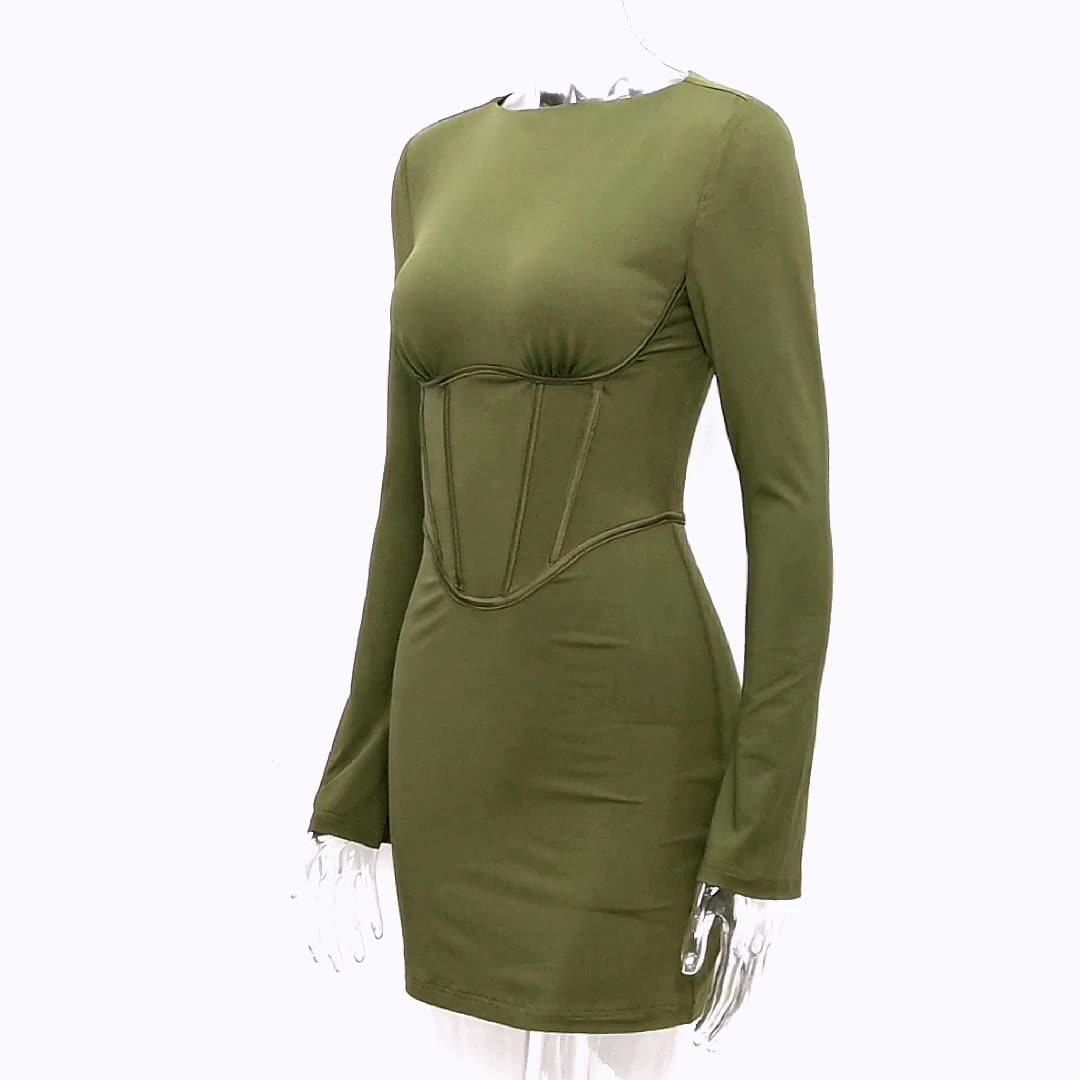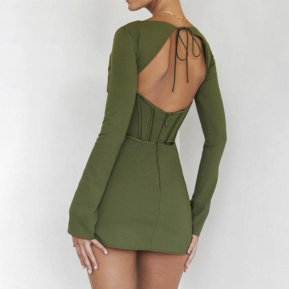 This long-sleeved dress features a fish-bone waist that elongates the torso and emphasizes the slim silhouette. Its backless design further accentuates the elegant figure for a perfect look. Its fabric is lightweight. comfortable and breathable. making it a perfect choice for any occasion.