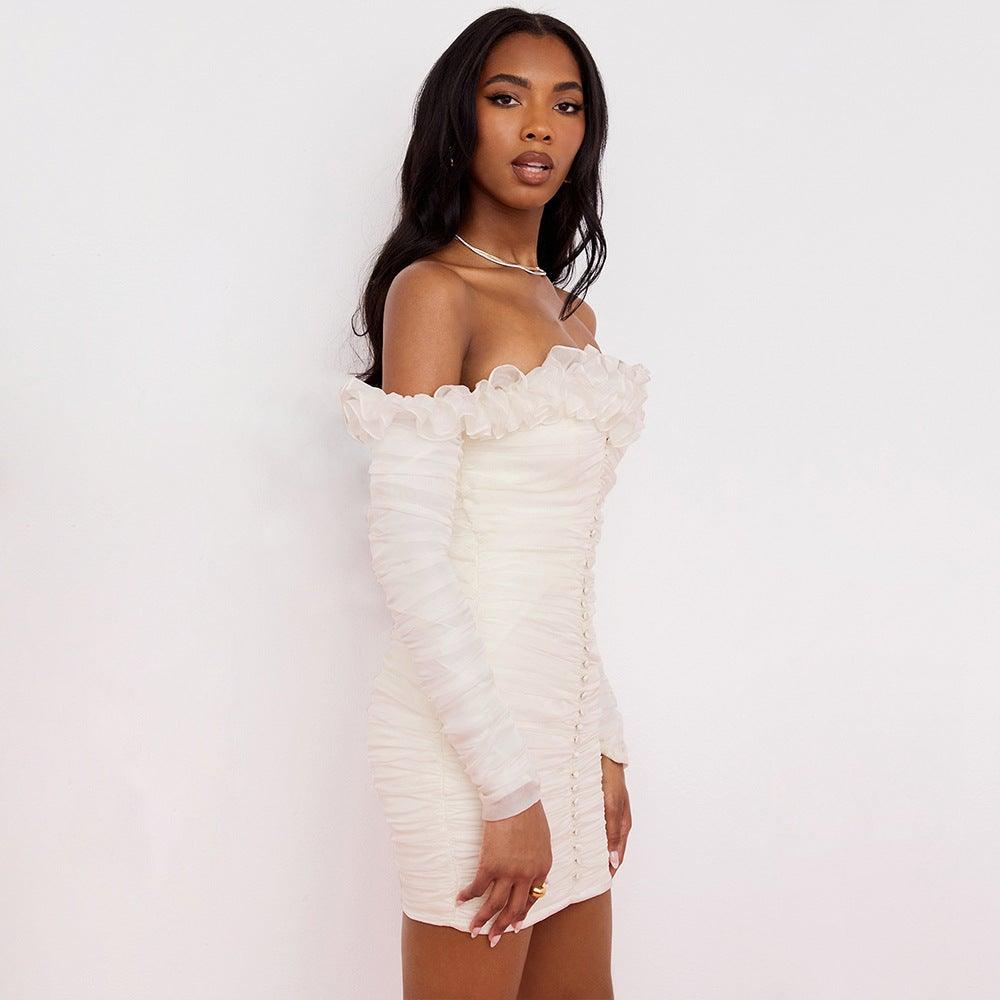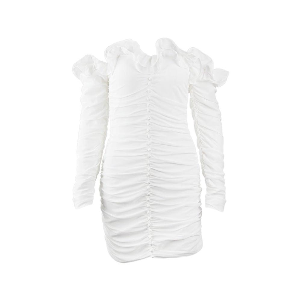 This elegant dress is crafted from lightweight chiffon fabric. with a long-sleeve single-shoulder neckline and an easy-fit. slimline silhouette. The design features an adjustable drawstring waist and a flattering mid-length skirt. perfect for any formal occasion. With its breathable. wrinkle-free construction. this dress offers comfort and style.