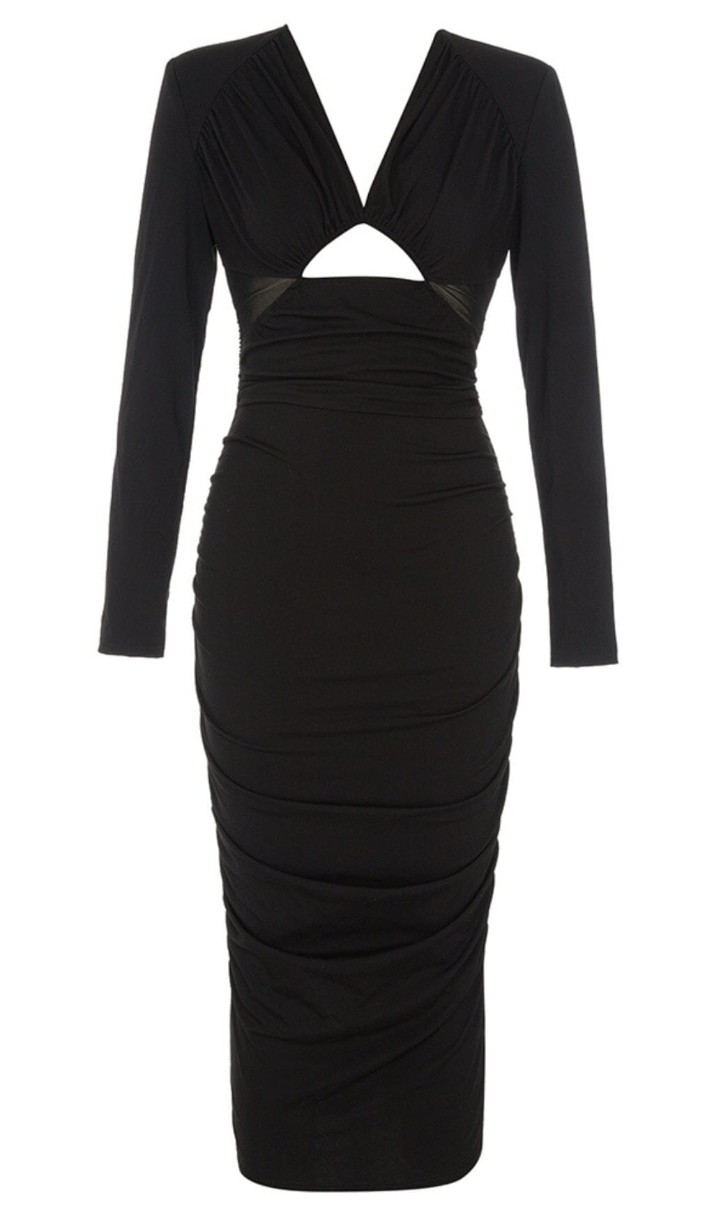 Our LONG SLEEVED V NECK PLEATED MIDI DRESS IN BLACK luxury and we know you'll be glowing in this one. The V-neck can better show your perfect shoulder and neckline. and the hollow part at the waist makes you look sexier. cut-out shaped detailing keeps you secure. Designed in smooth satin fabric and rayon. our mini dress looks best when paired with lace-up heels and a chic clutch bag. It's time to lead the extravagant lifestyle you deserve.