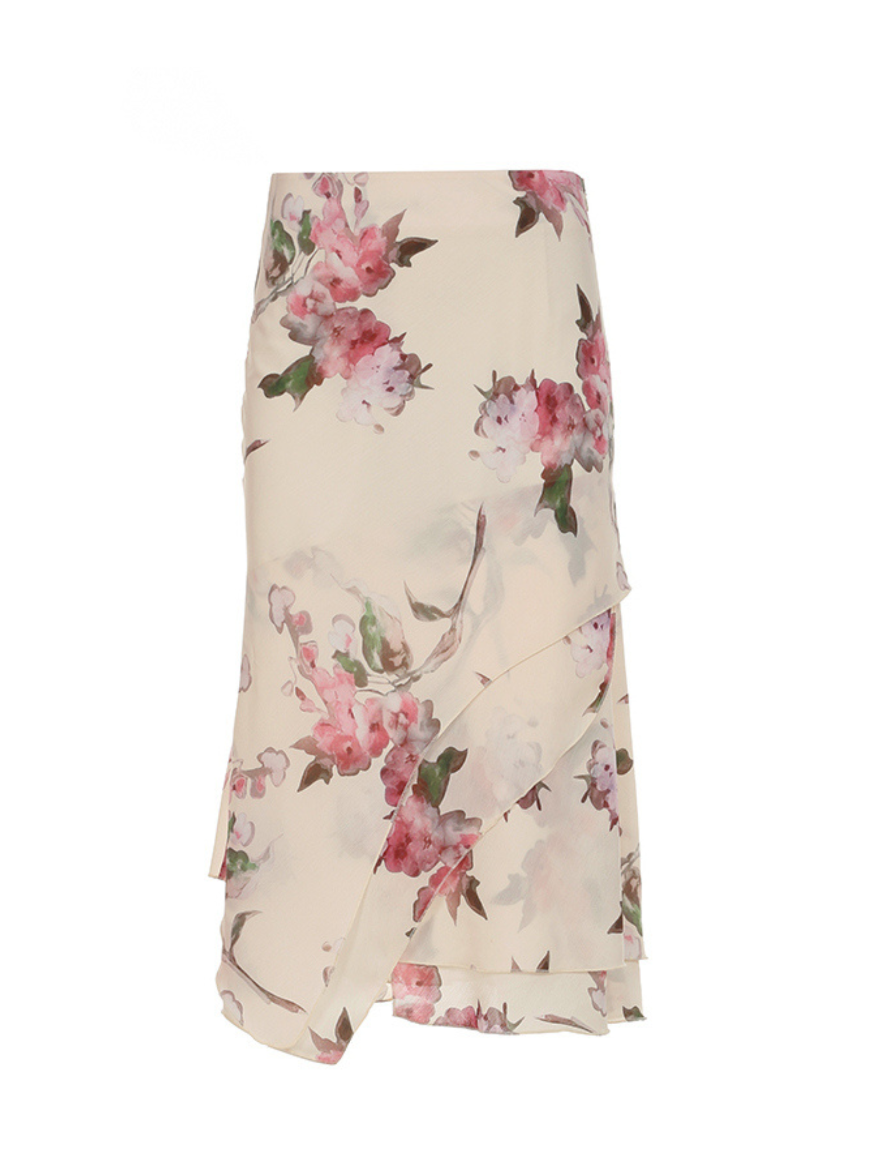 Lucia Floral Midi Skirt brings timeless romance to your wardrobe. Featuring a soft cream base adorned with delicate pink and green floral prints. this piece flows with a lightweight chiffon fabric that drapes beautifully. The wrap-effect ruffle detailing adds movement and grace. making it perfect for both brunch dates and garden strolls.