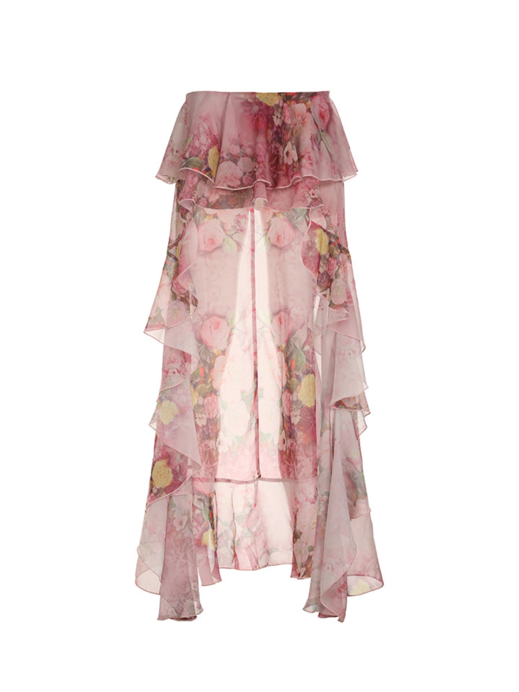 This skirt is a stunning blend of elegance and boldness. Designed with a high-low silhouette. it features a cascading ruffle overlay that flows gracefully with every step. The floral print in soft. romantic shades adds a delicate touch. while the lightweight. sheer fabric gives it an airy and feminine feel. The skirt is perfect for making a statement at any special occasion. combining the softness of its floral design with the daring cut that showcases your legs beautifully. Whether paired with a crop top or a fitted blouse. this skirt is a true showstopper.