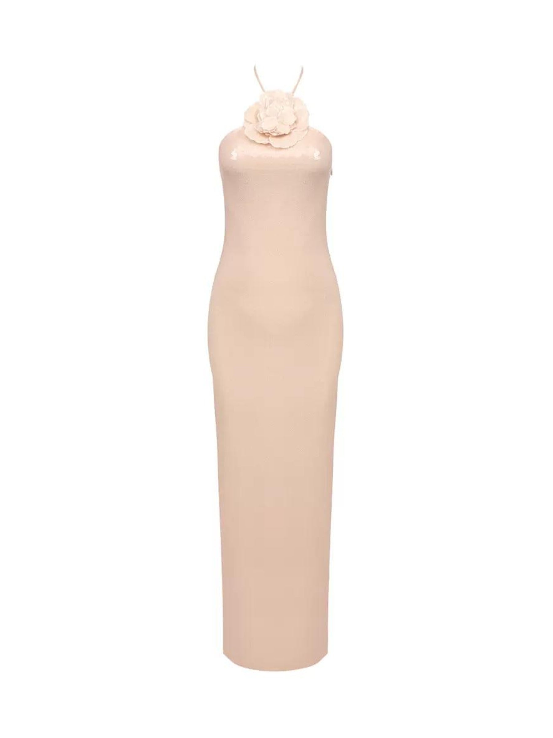 Step into the spotlight with the Lyra Sequin Maxi Dress in Peach. a stunning creation that effortlessly combines elegance with a touch of playful charm. This beautiful dress features a sophisticated halterneck and sleeveless design. offering a sleek silhouette that is perfect for any special occasion. The delicate floral details add a layer of femininity. while the shimmering sequin embellishments ensure you sparkle from every angle.