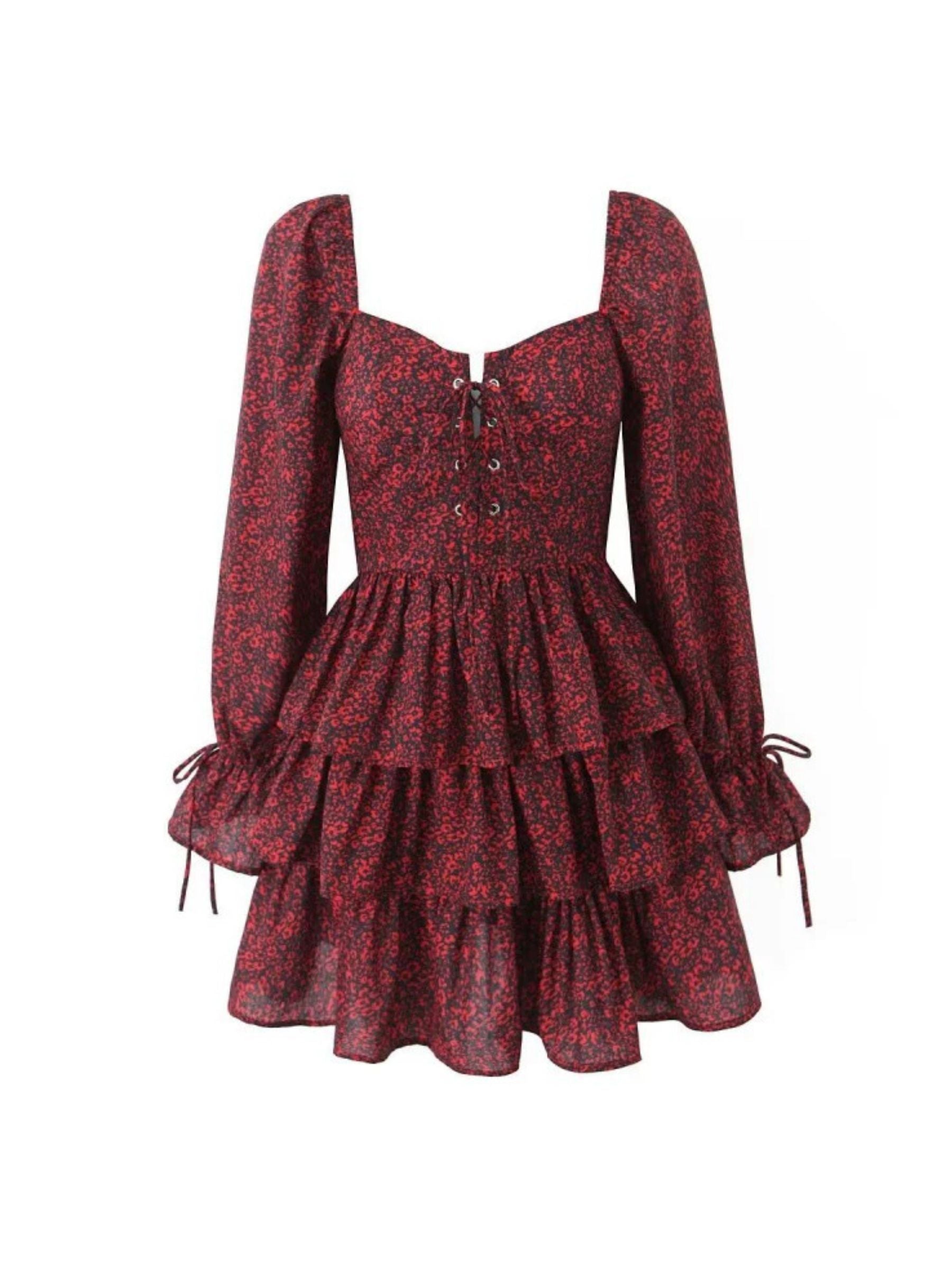 Embrace elegance with a bold twist in this stunning red and black floral mini dress. Featuring a flattering sweetheart neckline and charming lace-up front. this dress exudes a romantic vibe. The tiered ruffle skirt and puffed sleeves with tie details at the cuffs add a playful. boho-inspired touch. making it perfect for any occasion where you want to stand out.
