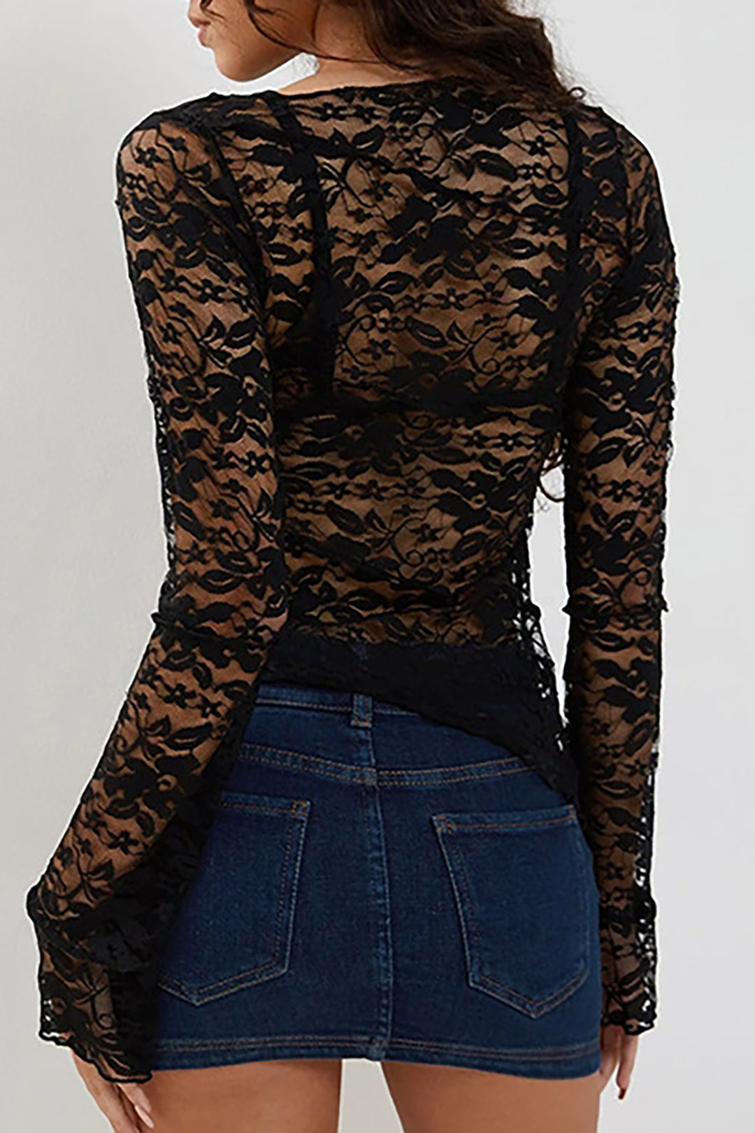 Floral Lace Sheer Asymmetric Long Sleeve Top