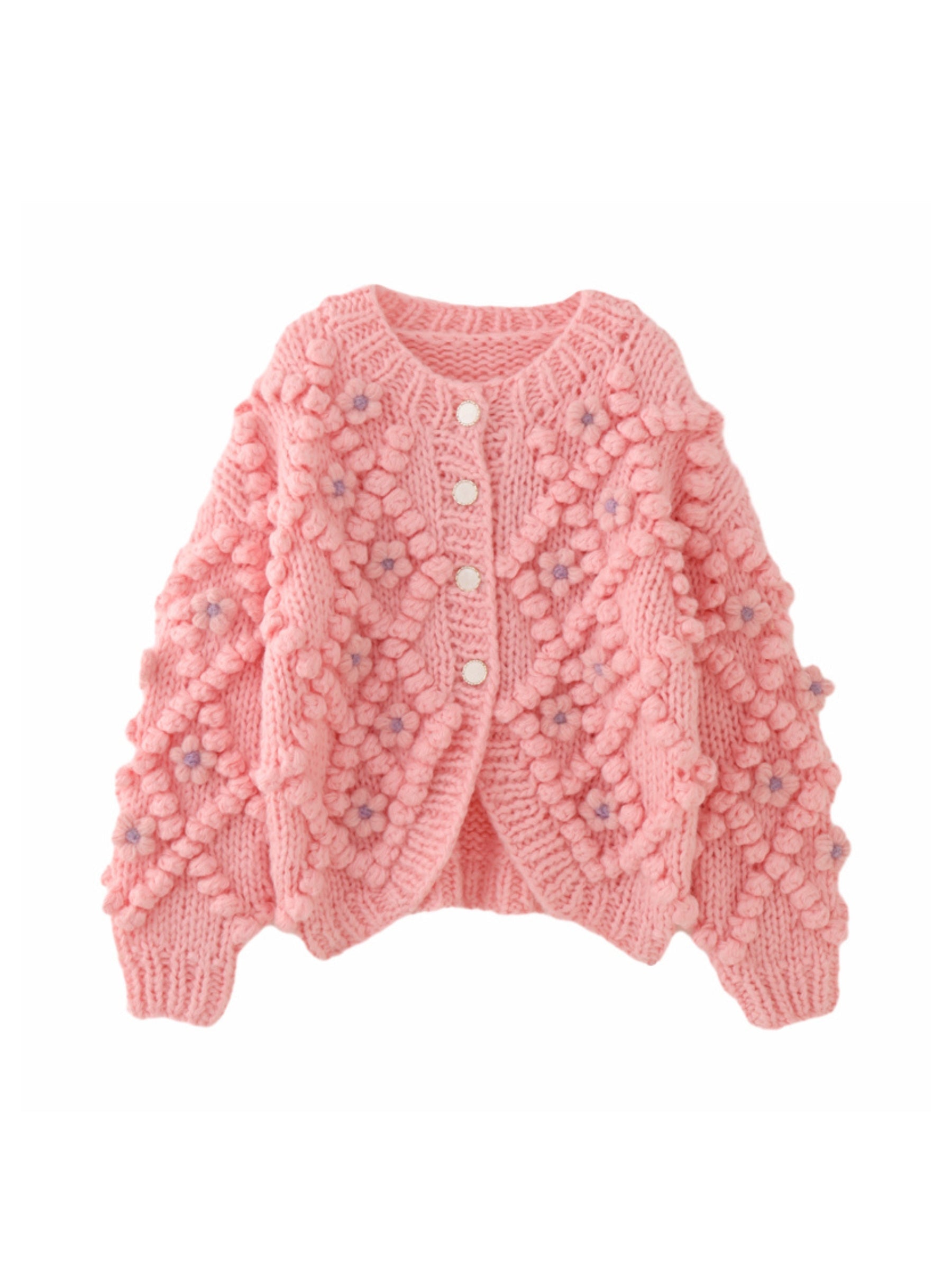 Add a touch of floral charm to your wardrobe with the Melia Floral Knit Cardigan. Featuring an intricate. hand-knit design adorned with delicate floral details. this cardigan brings a cozy and whimsical feel to any outfit. Its soft pink hue and unique texture make it a standout layering piece for cooler days.