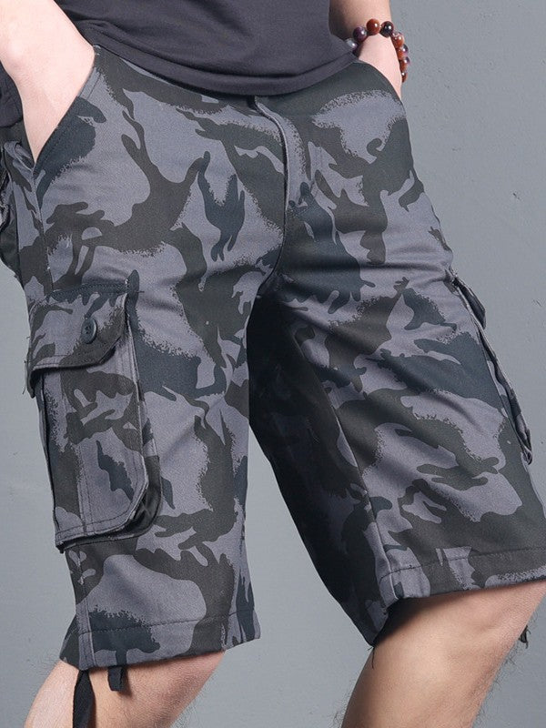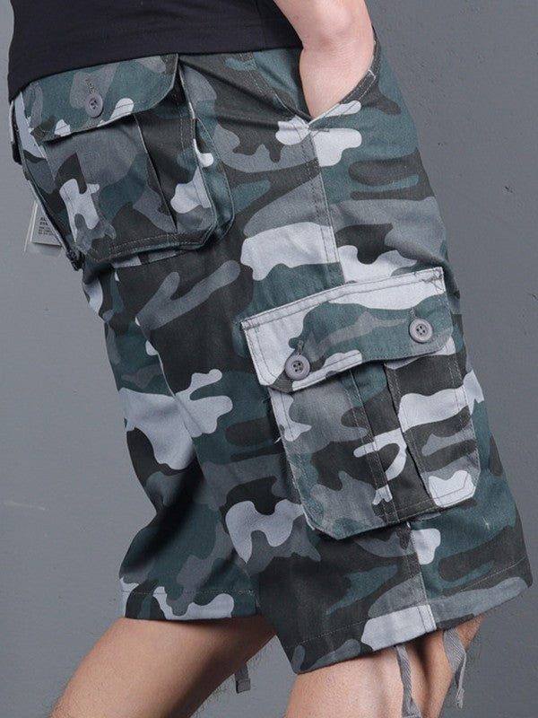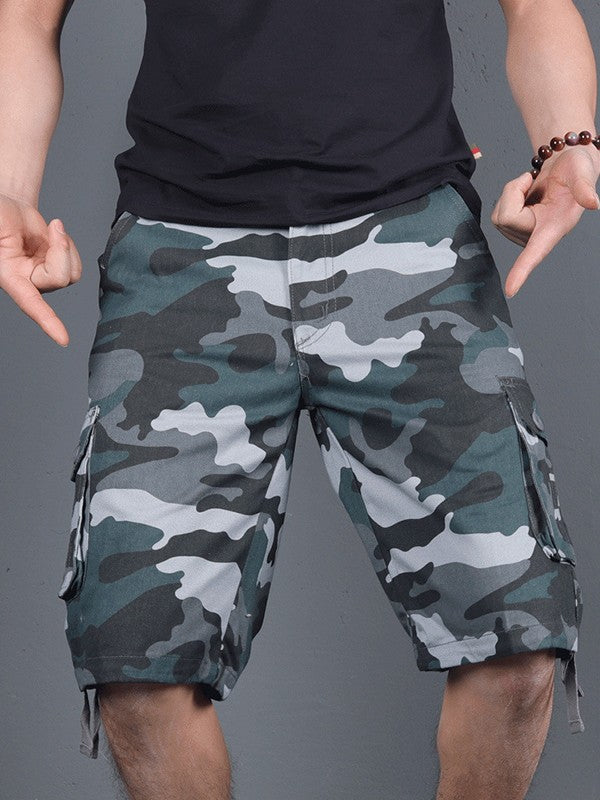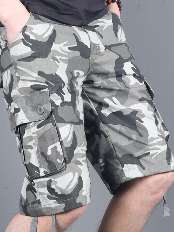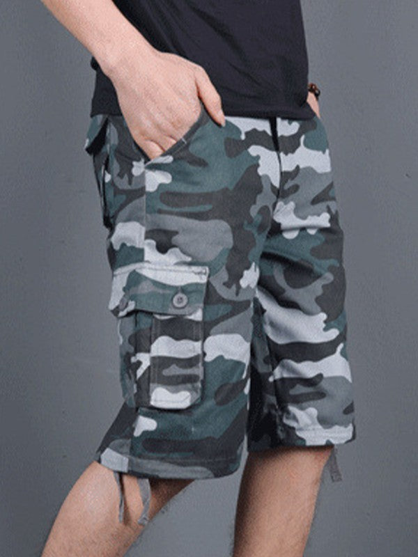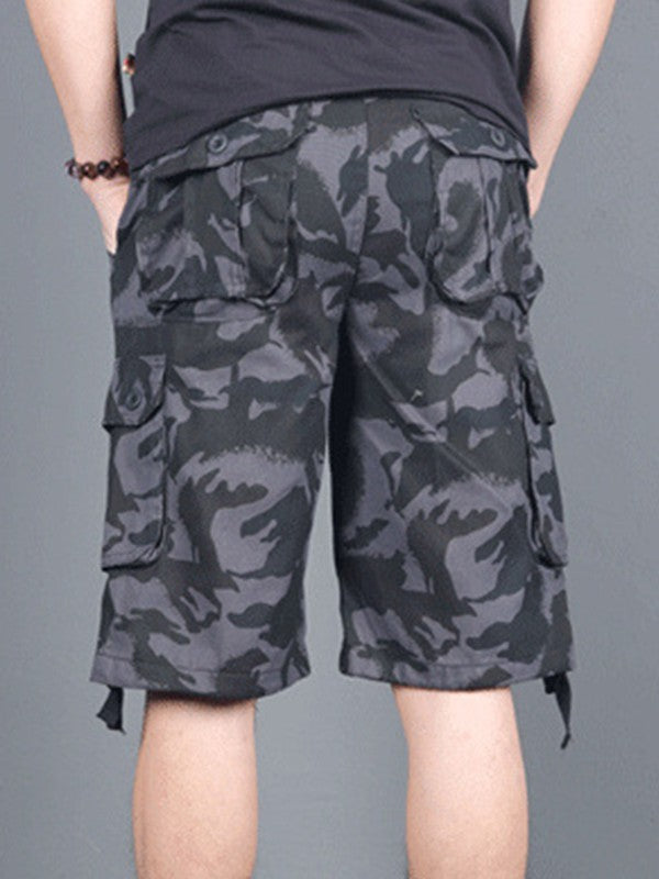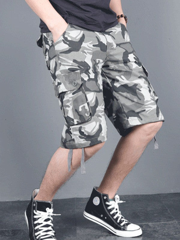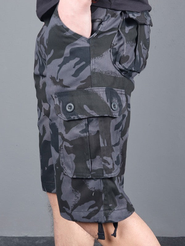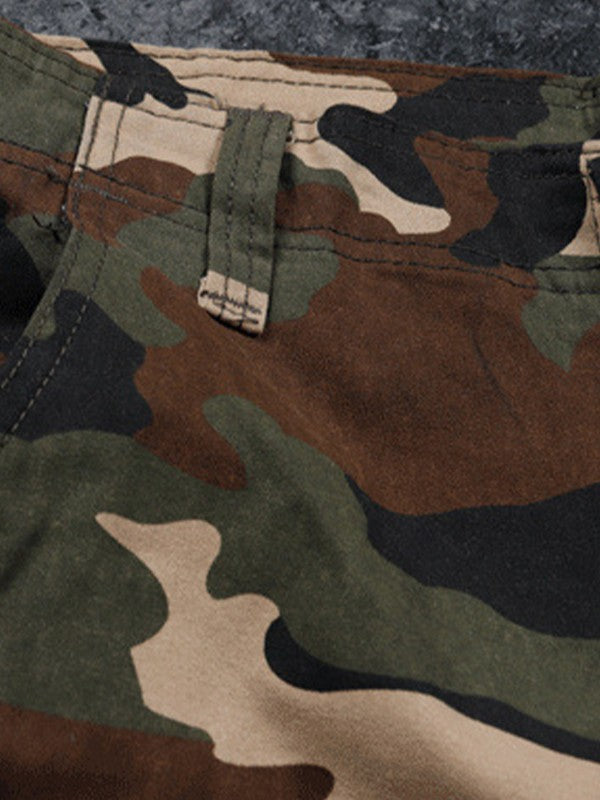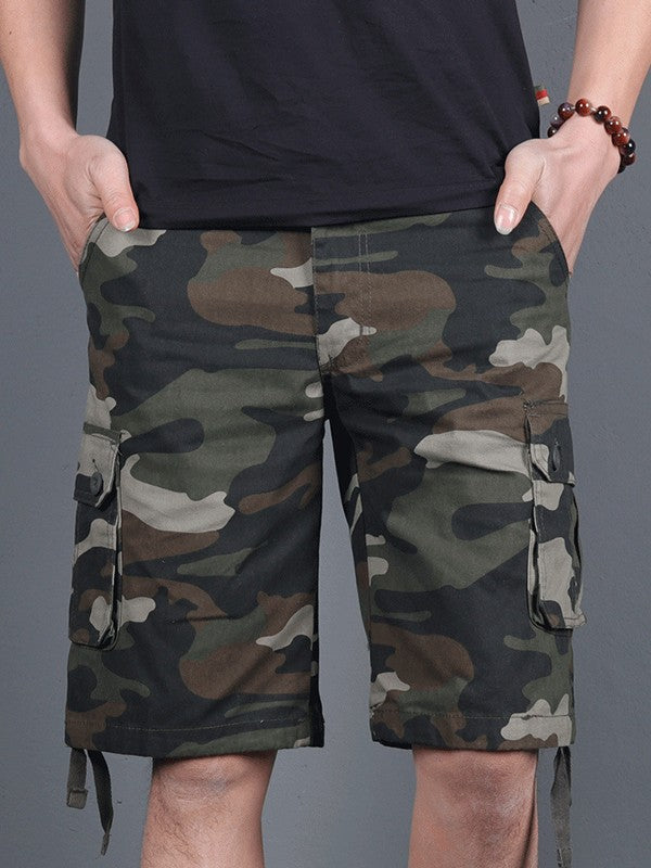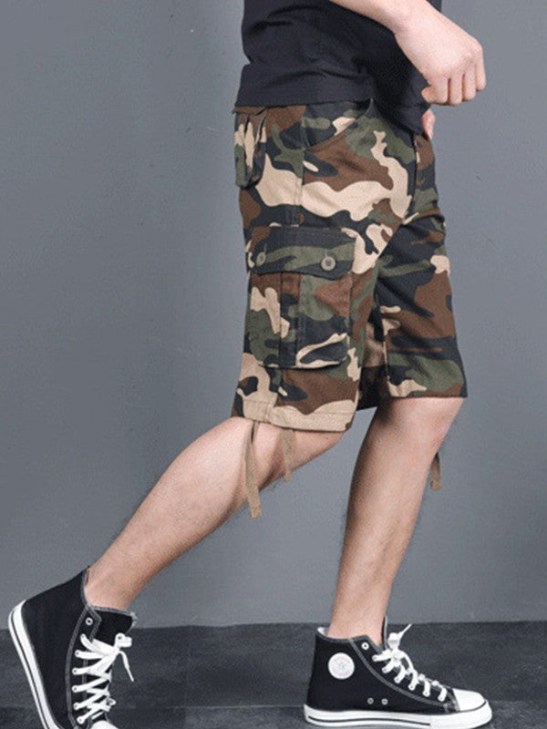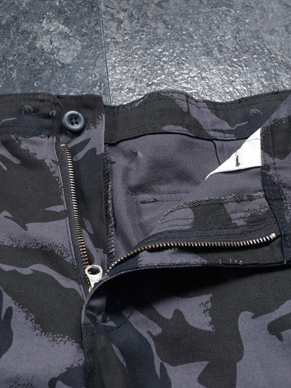 Description: Shaped to a straight-leg silhouette. these shorts are made from cotton fabric. inspired by camo pattern print allover. features functional cargo pockets style. and drawstring tie on the cuffs. ended with a button zip fly.