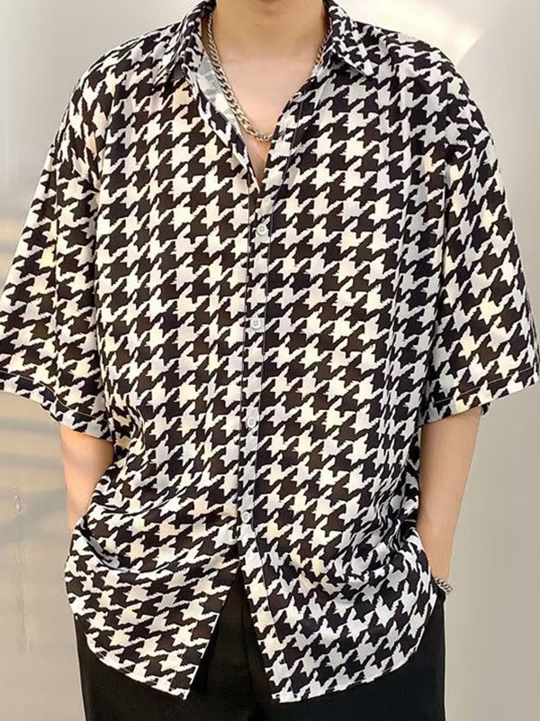 Description: Shaped to a fitted silhouette. these vintage short sleeve shirts printed with houndstooth checkered pattern. with drop shoulder and front button fasten design.