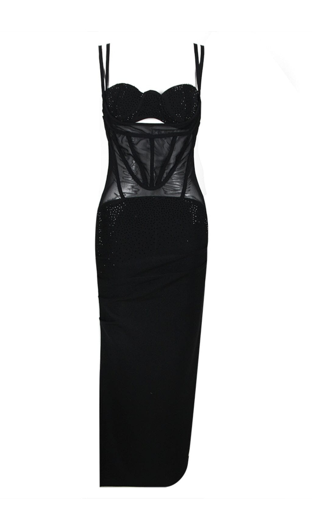 Make a statement in the Mesh Corset Split Midi Dress in Black. the perfect combination of sexy and sophisticated. Made from a lightweight and breathable mesh fabric. this stunning dress features a corset-style top with a sweetheart neckline and lace-up design that enhances your curves and gives you a flattering hourglass silhouette. The sleek and fitted midi skirt features a sultry thigh-high split. adding a touch of drama and sex appeal to the overall look.