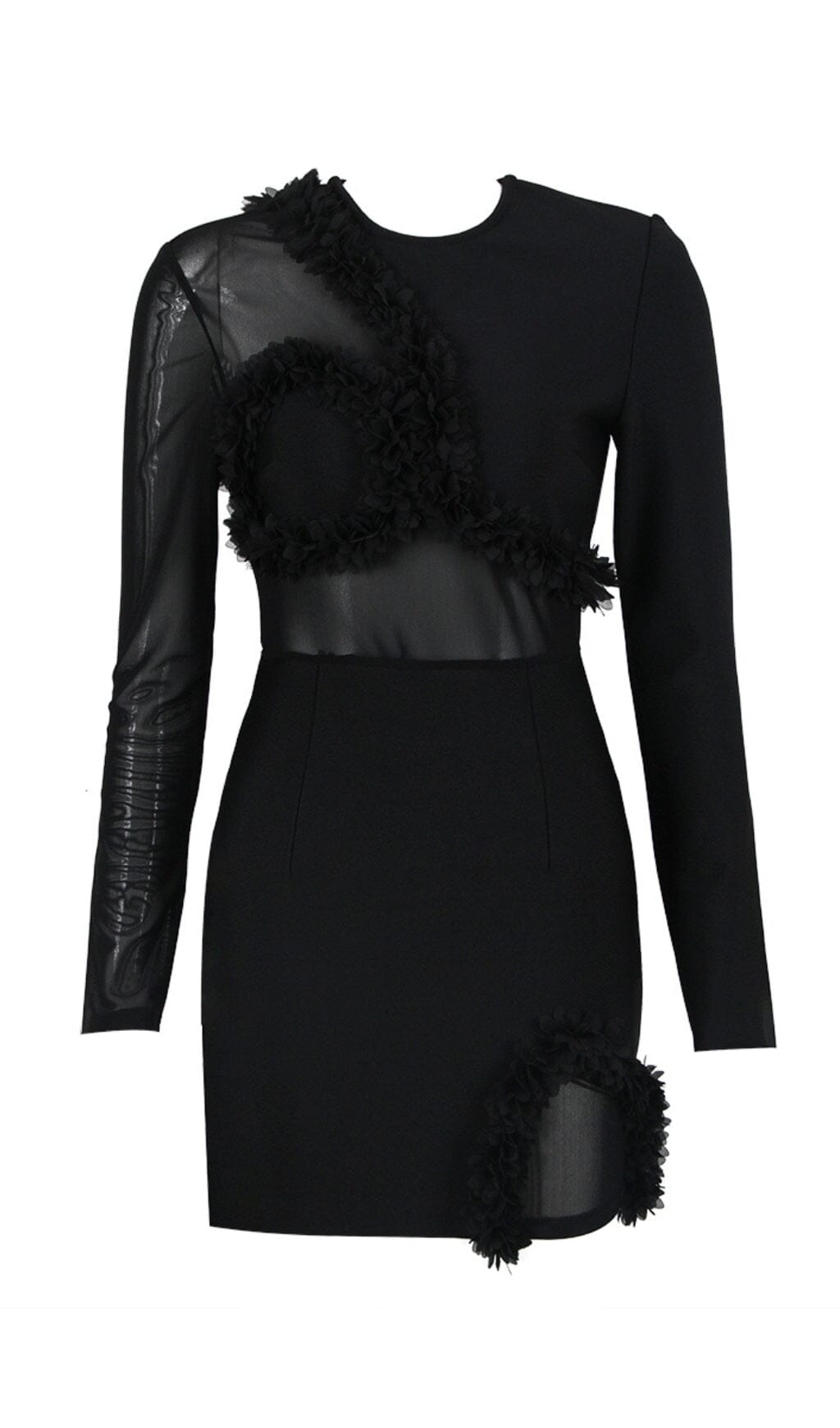 Which hottie can lack such a sexy black minidress in her wardrobe? The bold stitching design breaks the dull feeling brought by the original black. and stitches ordinary basic fabric with mesh fabric. Half of the skin is hidden under the clothes. half is looming. and the sexy charm gushing out. The chest and hem are decorated with flowers. which enriches the overall visual effect and makes the whole dress look charming but not frivolous. The waist is also covered with mesh fabric. showing a beautiful waist curve. The high waist design visually elongates the legs. which coincides to cover the length of the buttocks to better show the beauty of the body lines. Put on this sexy dress. immediately turn into a hot girl and melt the whole summer.