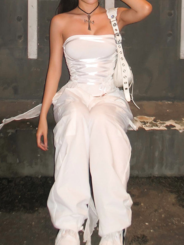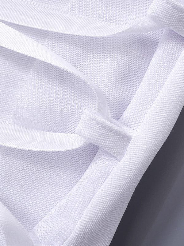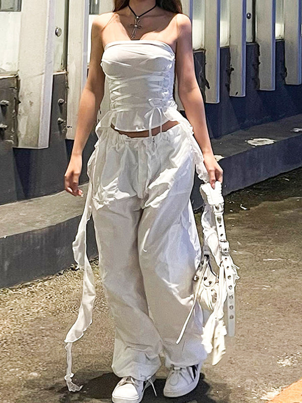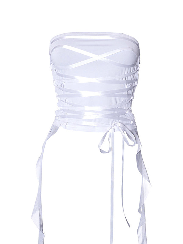 Description: These tube tops have mesh paneled design. it features criss cross tie fasten on the front. and with extended frill straps detailing.