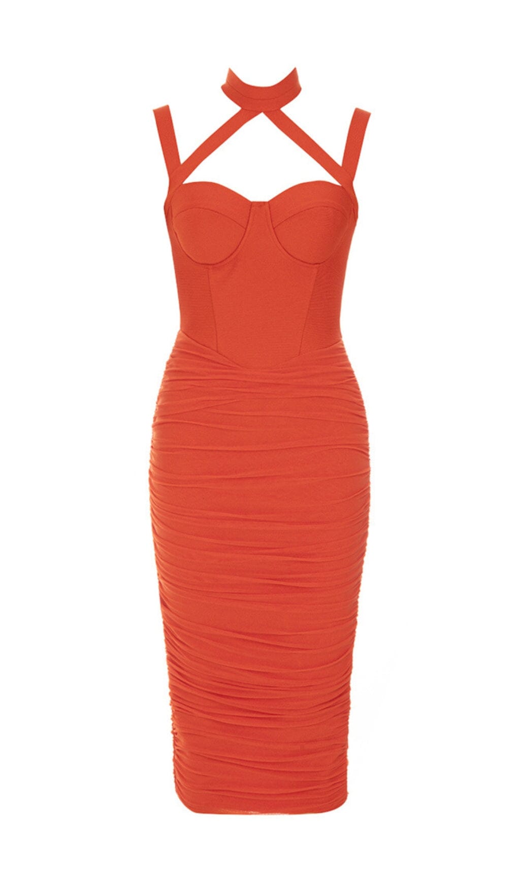Perfect for any summer event. the Mesh Ruched Midi Dress in Orange is sure to turn heads wherever you go. Its unique design and bold color make it a true standout piece. Pair the dress with your favorite heels and statement jewelry to complete the look.
