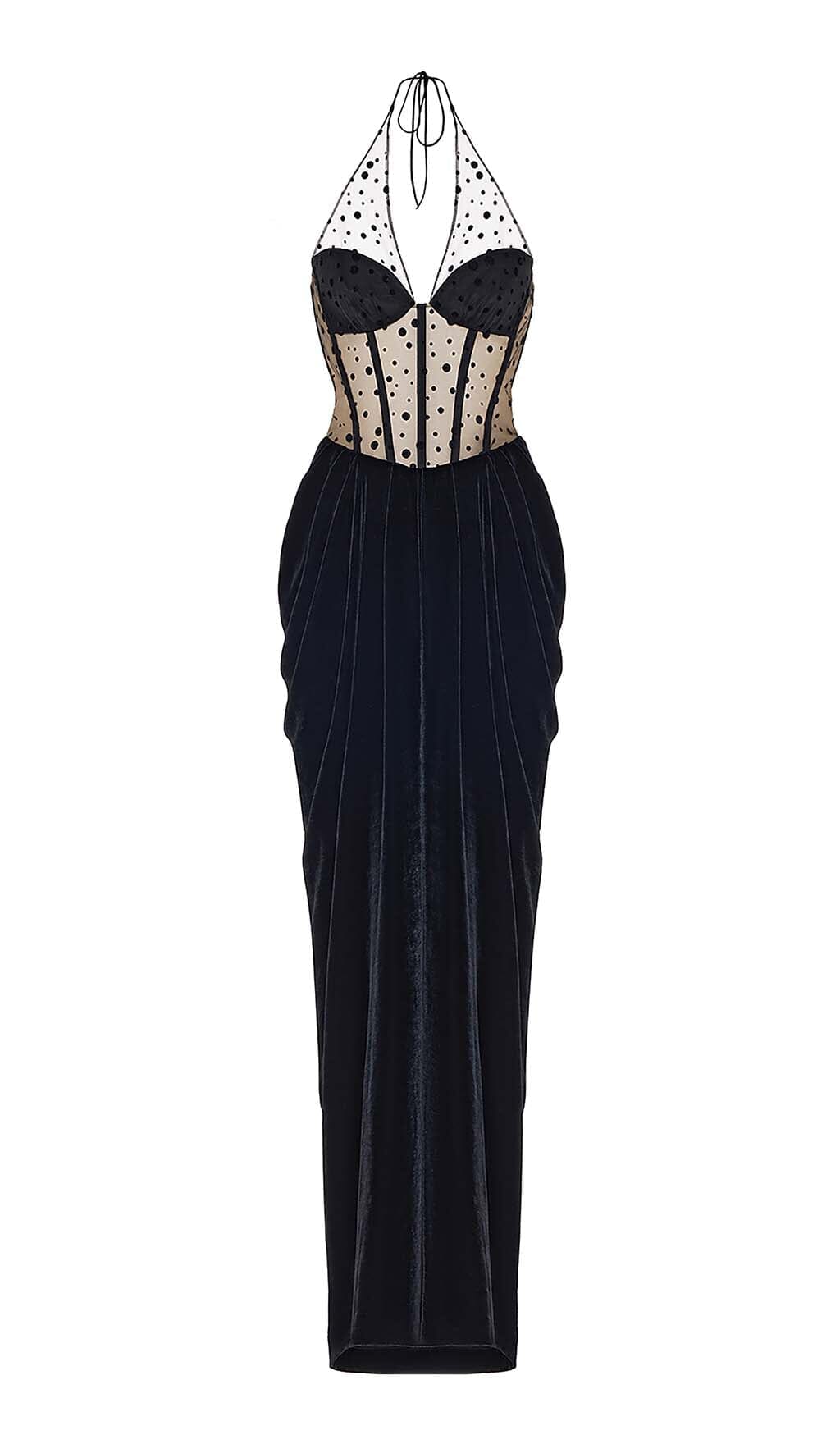 Looking for a maxi dress that makes a statement? Look no further than our Mesh Velvet Maxi Dress! Made from a luxurious black mesh fabric. this dress is sure to turn heads. The figure-hugging silhouette and Velvet trim are sure to add a touch of glamour to any outfit.