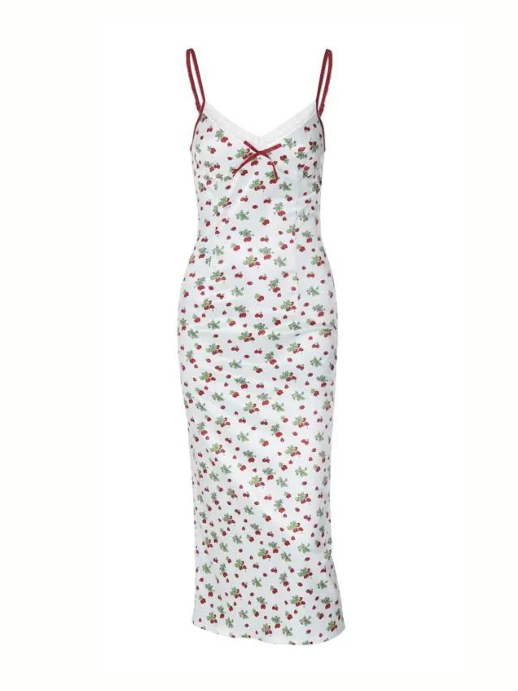 Get ready to turn heads with the Mina Cherry Print Midi Dress! This chic and playful dress features a low back. v-neck and lace splicing neckline for a flirty look. The slim fit and spaghetti straps add a touch of sexiness. perfect for the Aesvs Spring-Summer Collection.