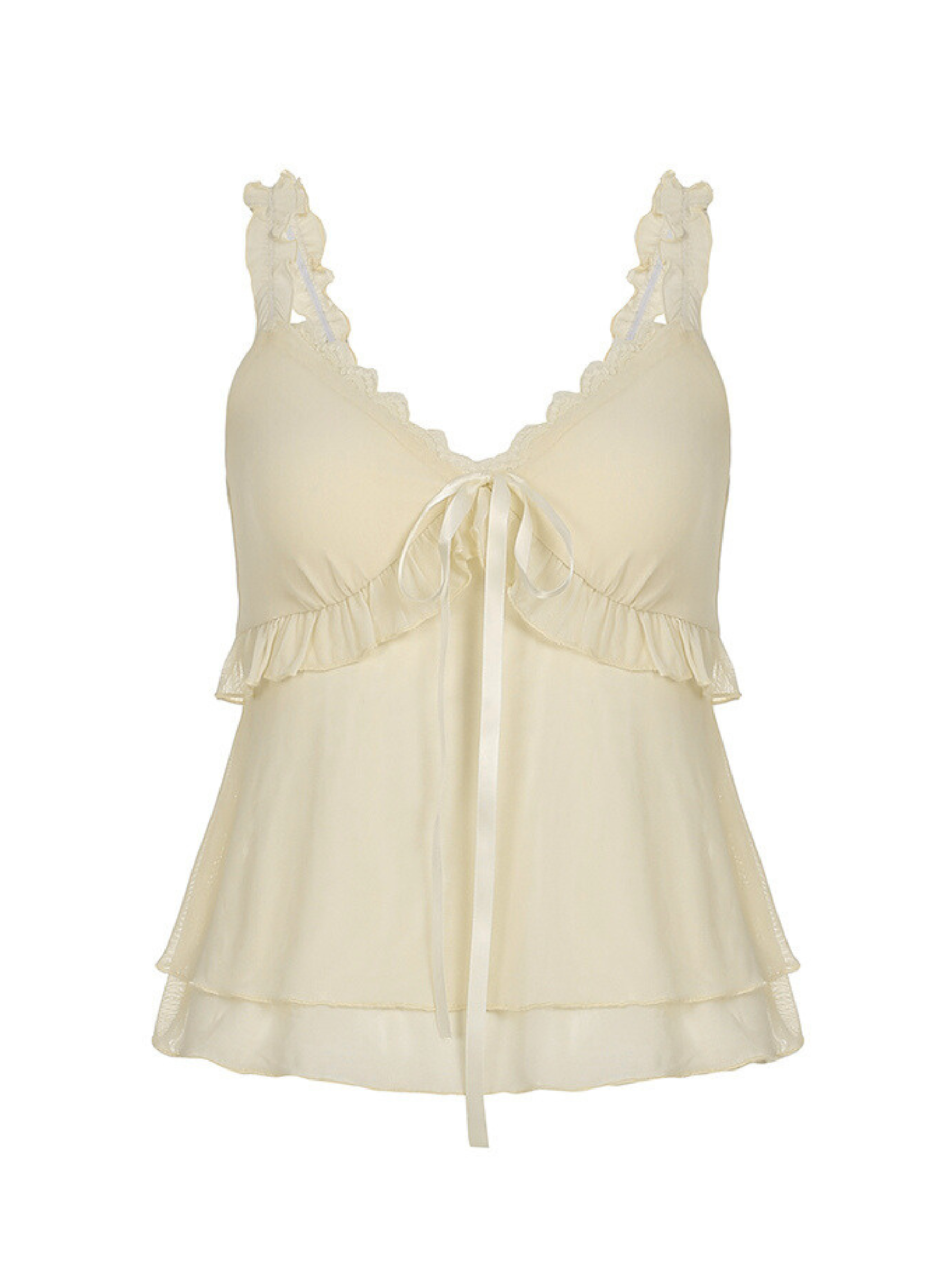 The Natalie Ruffle Bow Mesh Top is a dreamy blend of softness and feminine charm. Crafted in a light yellow hue. this top features delicate ruffle straps and lace-trimmed details. making it the perfect piece for a flirty. carefree vibe. The ribbon-tie front and flowy double-layer chiffon design add a playful touch. while the lightweight fabric keeps things breezy for summer days and sunset dates.