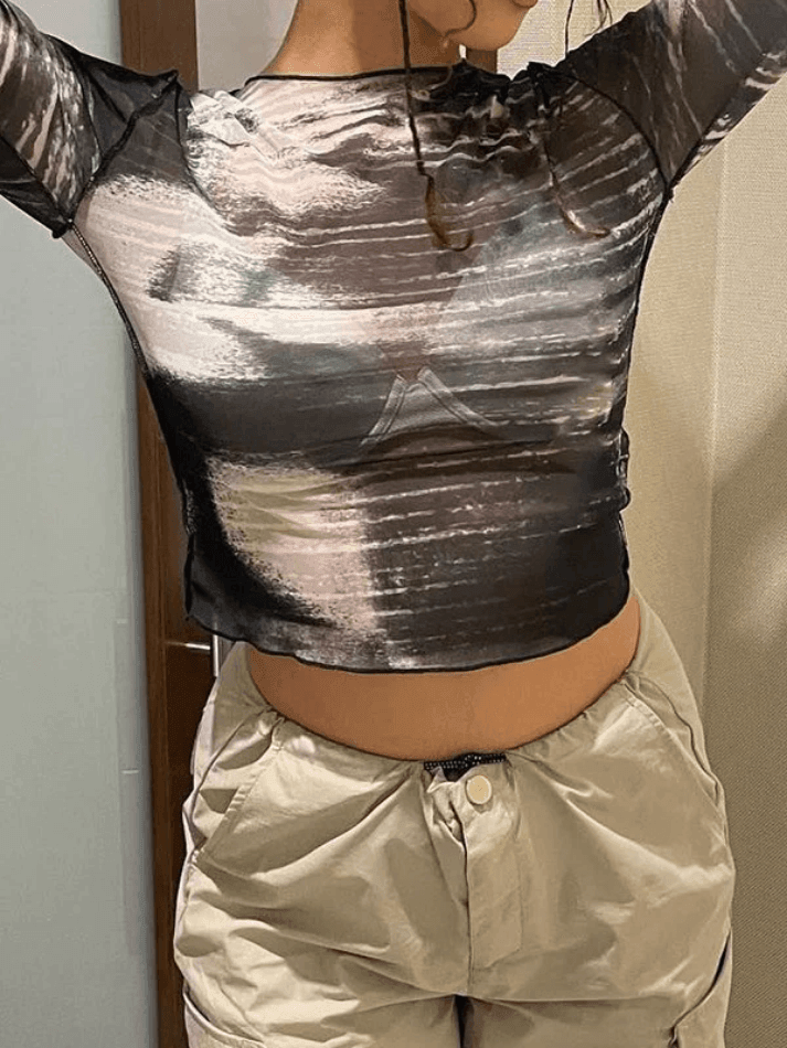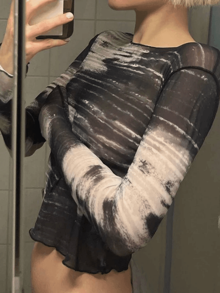 Description: Unleash your edgy side with this dark grungy-inspired mesh crop top. Crafted from high-quality mesh fabric. it boasts a slightly cropped length and features an abstract dyed pattern print all over. The seamed lettuce edge design adds a touch of uniqueness to your look. Get ready to turn heads!