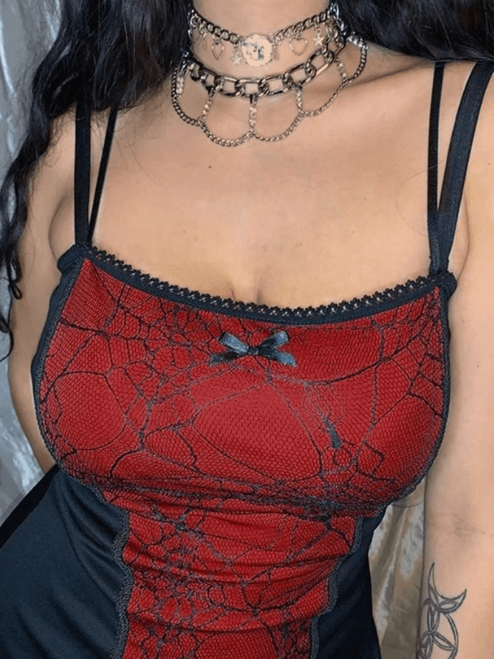 Description: Embrace your dark side with our Cobweb Mesh Crop Cami Top. Featuring a unique and edgy cobweb mesh paneled design. this top adds a touch of gothic style to your wardrobe. The slim fit and adjustable shoulder straps ensure a customized and comfortable fit. Made from a blend of cotton and spandex. it offers both comfort and stretch. The straight neckline enhances your feminine look. while the exposed zip fly on the back adds an element of sexiness and edginess to the overall design. Get ready to turn heads and make a bold fashion statement with this must-have piece.