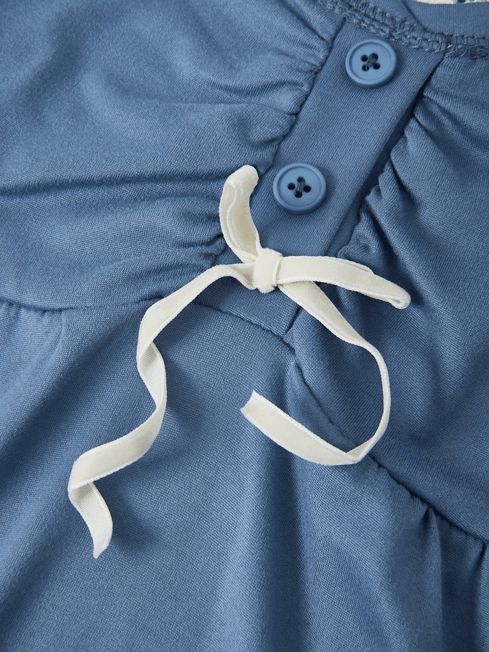 Design: Broderie Lace Paneled At Collar. With a Bow Decor. Button Front Closure