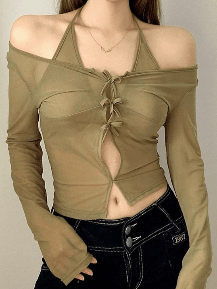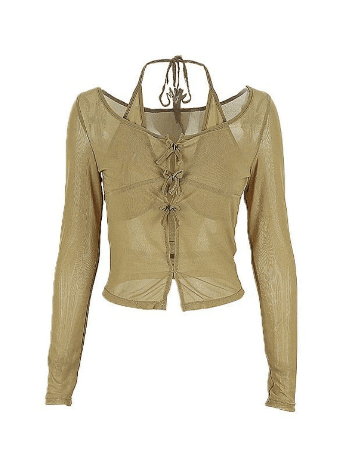 Description: Embrace the allure of this Patchwork Sheer Mesh Crop Top. Made from a stretchy semi-sheer mesh fabric. it combines edgy patchwork design with a flattering slim fit. The halter neck and dainty bow decors add a touch of sweetness. while the front cutout detail brings a hint of sexiness. Perfect for your casual. street. Y2K-inspired or fairy grunge looks. this top will make you obsessed.