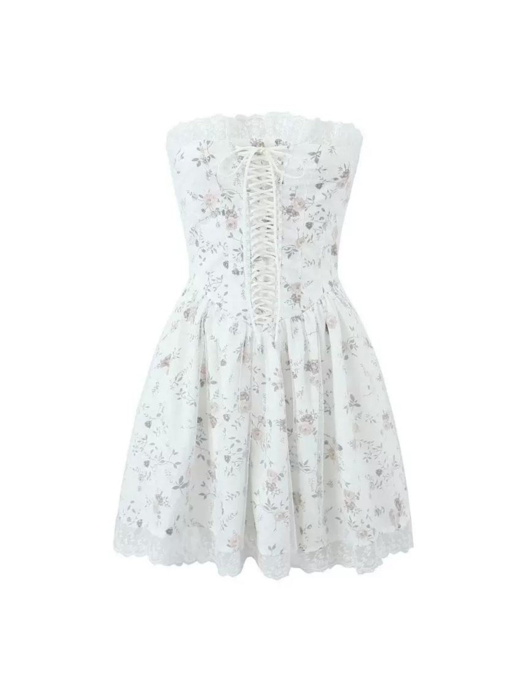 A romantic Penny Floral Mini Dress with a high waist and lace detailing. Strapless with a strappy cross design. this dress from the Aesvs collection is available in both white and black. Perfect for a feminine and playful look.