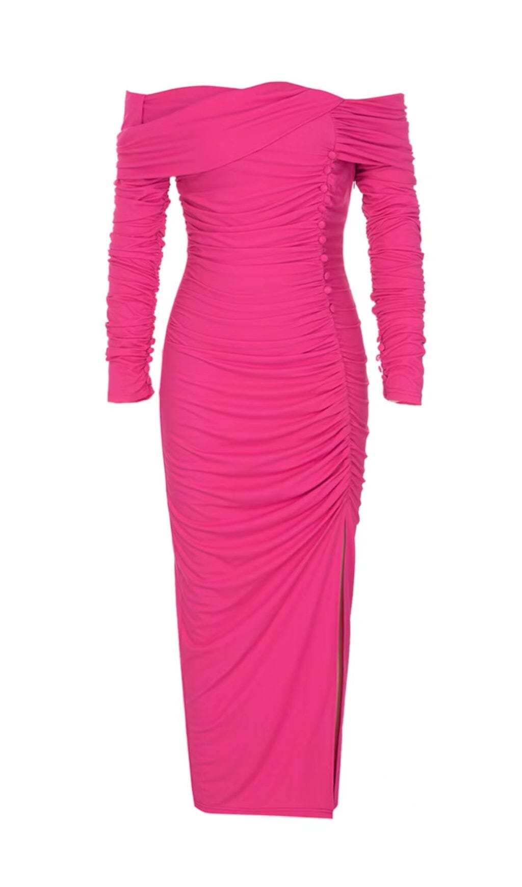 Tired of those so-called classic colors? Break the boring black. white and gray. and let you become the focus of the audience. You must try this lovely dress. The bright pink is full of modern urban flavor. and the design of the shoulder reveals your sexy back and clavicle. The high split that extends to your thigh allows you to fully open your aura and show your charming curve with confidence. Along the slit up seam. we not only highlight your good figure. but also decorate the small buttons of the same color. making the whole design full of layers and details. looking cute and delicate. Wearing it. you will be the most eye-catching scenery in all activities.