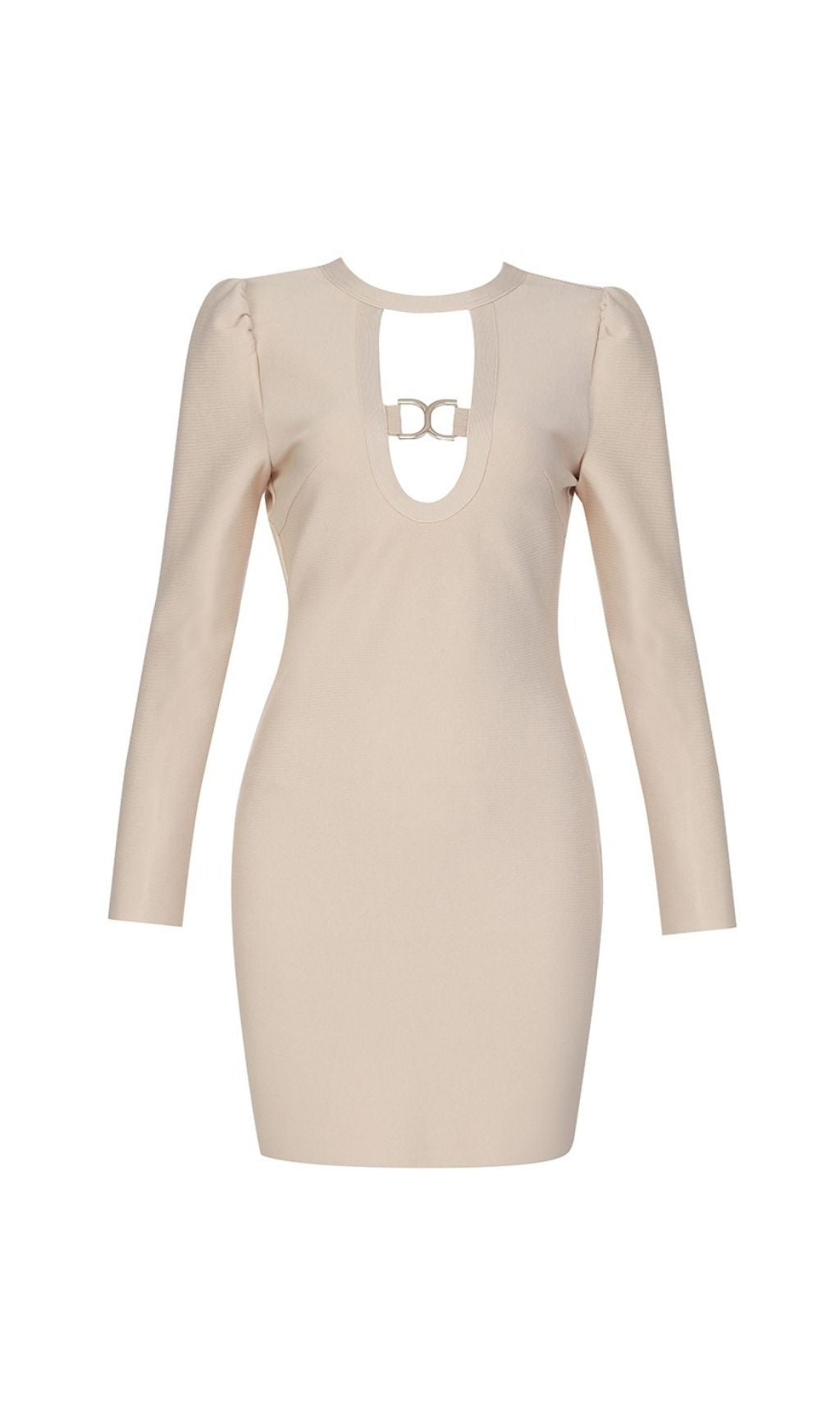 heels in nude and a mini clutch.