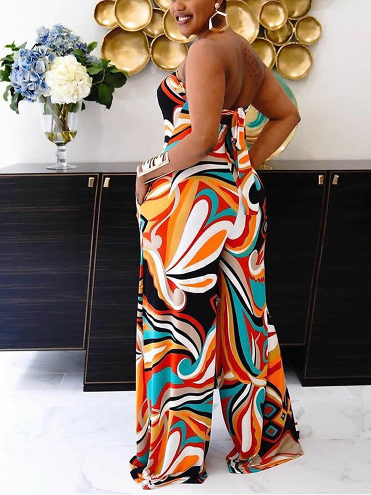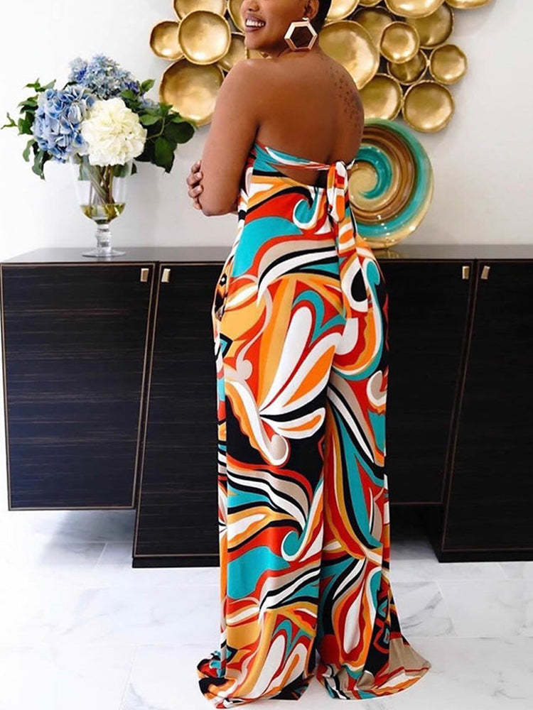 Print Split Joint Strapless Straight Jumpsuits