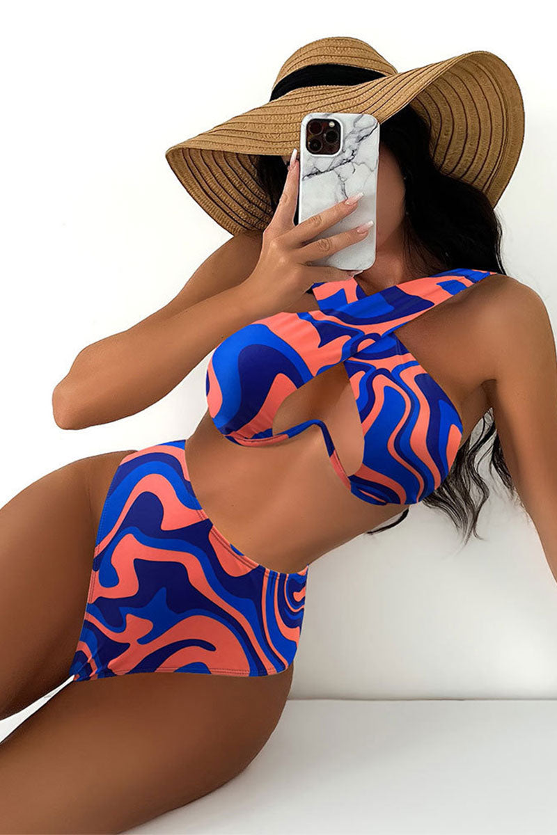 Ripple Print Cross Halter Flirty High Waist Bikini