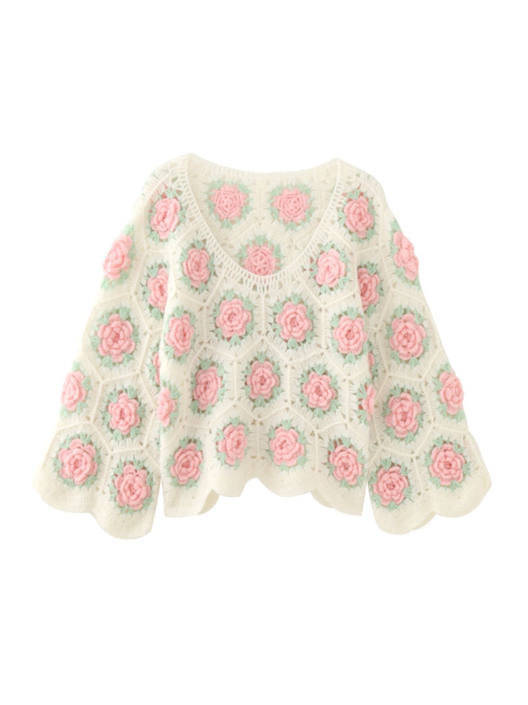 Embrace the charm of blooming roses with the Rosa Handmade Crochet Sweater. This unique sweater showcases a stunning crochet pattern adorned with hand-stitched pink roses. adding a whimsical floral touch to your outfit. Its light cream base and airy design make it perfect for layering with elegance.