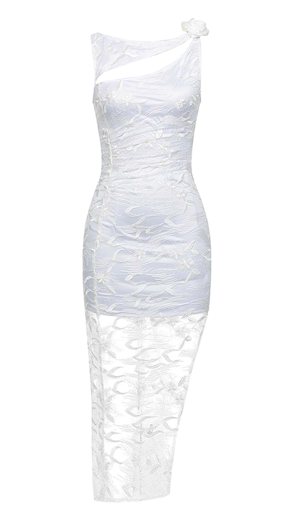 ROSE-EMBELLISHED LACE MIDI DRESS IN WHITE