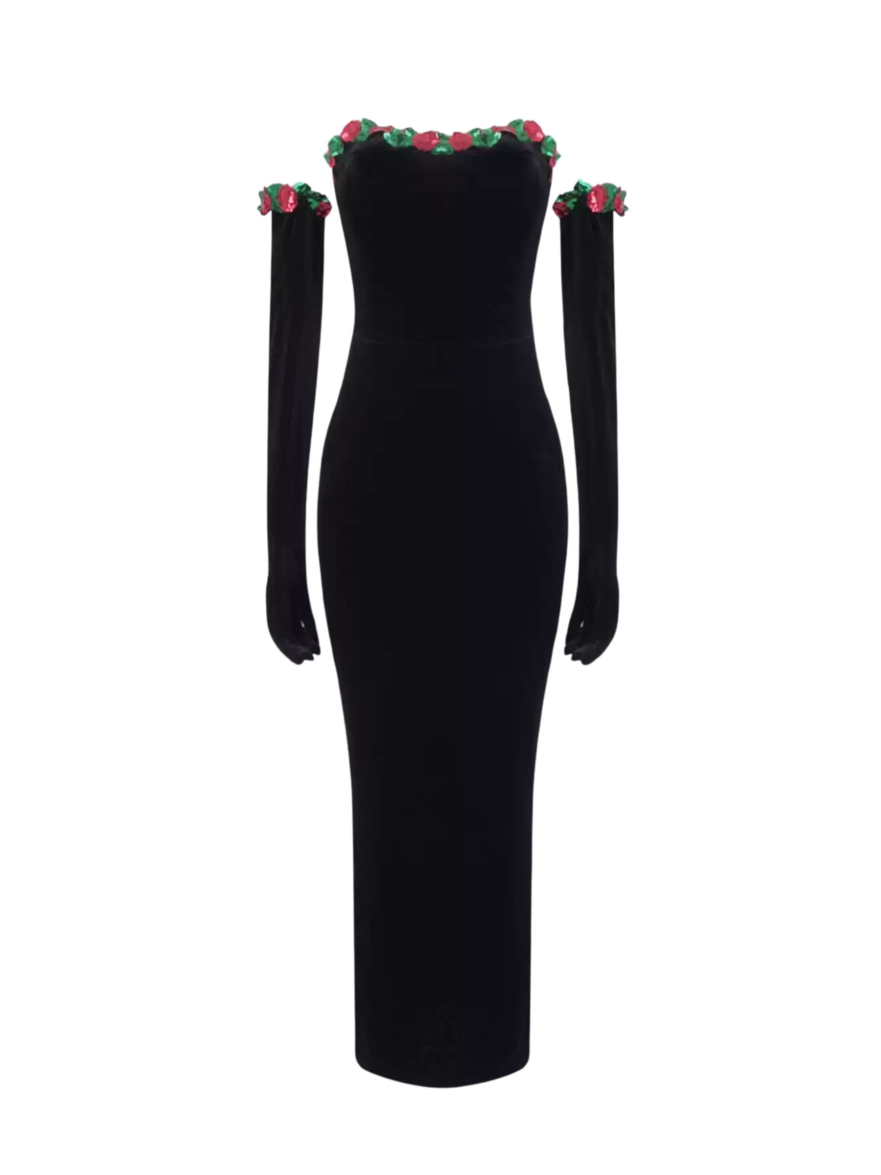 The Rosetta Embellished Velvet Maxi Dress is an exquisite statement piece designed to turn heads. Featuring a sleek off-the-shoulder design with delicate 3D floral embellishments. this gown embodies romance and sophistication. The rich velvet fabric hugs the body for a flattering silhouette. while the long fitted sleeves and back slit add a dramatic touch. Perfect for evening events. galas. or any occasion where you want to make a lasting impression.