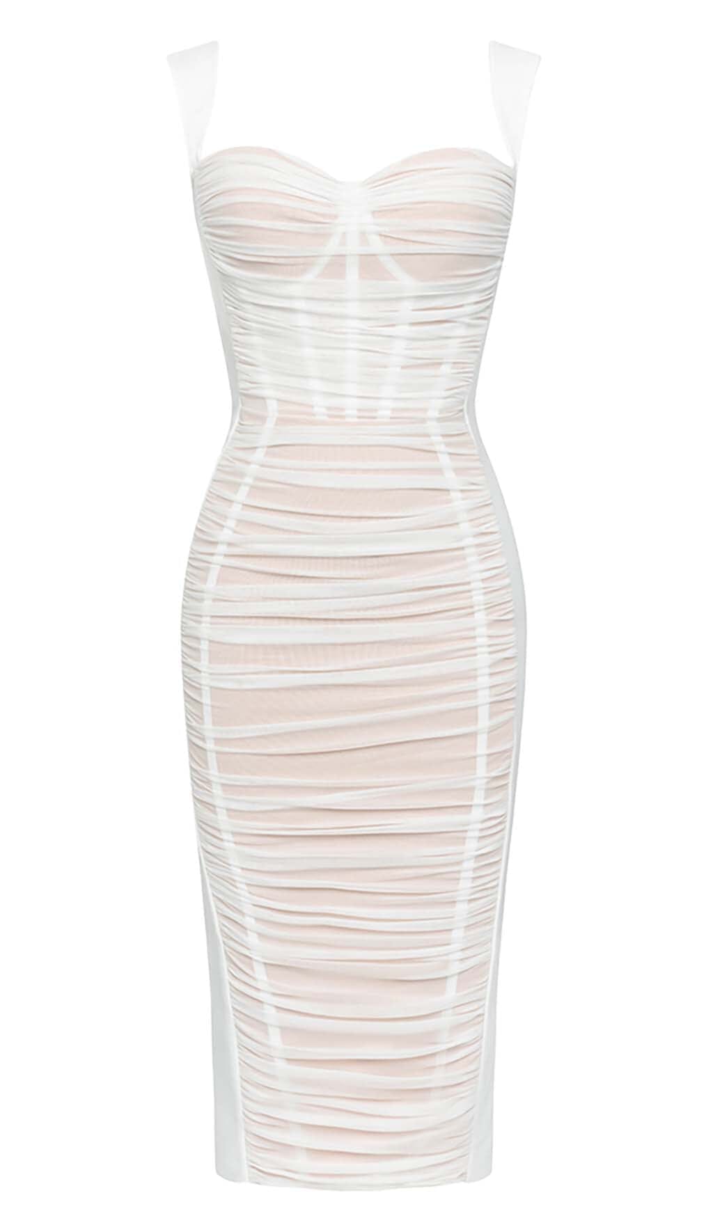 This beautiful Ruched Bustier Mesh Midi Dress is perfect for any special occasion! The white color is perfect for summer weddings or parties. and the ruched bustier top is sure to show off your curves! The mesh detail on the dress makes it lightweight and airy. perfect for those hot summer days. The midi length is also perfect for showing off your favorite shoes or sandals.