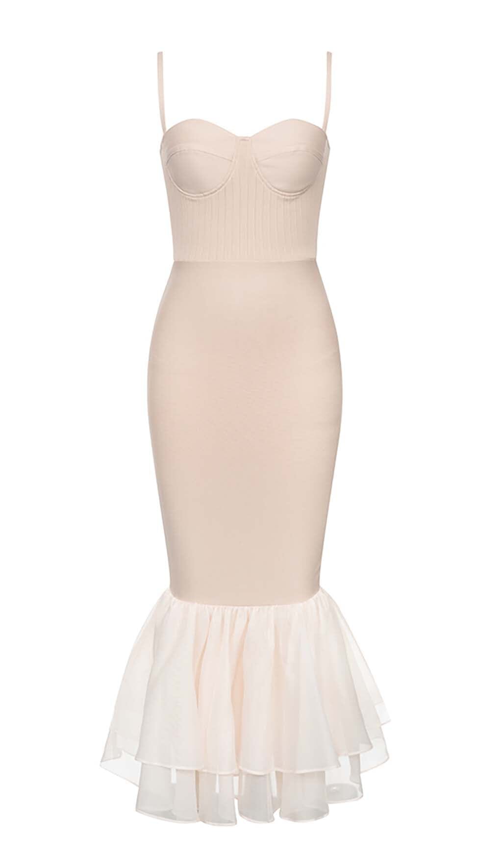 RUFFLE STRAPPY MIDI DRESS IN BEIGE