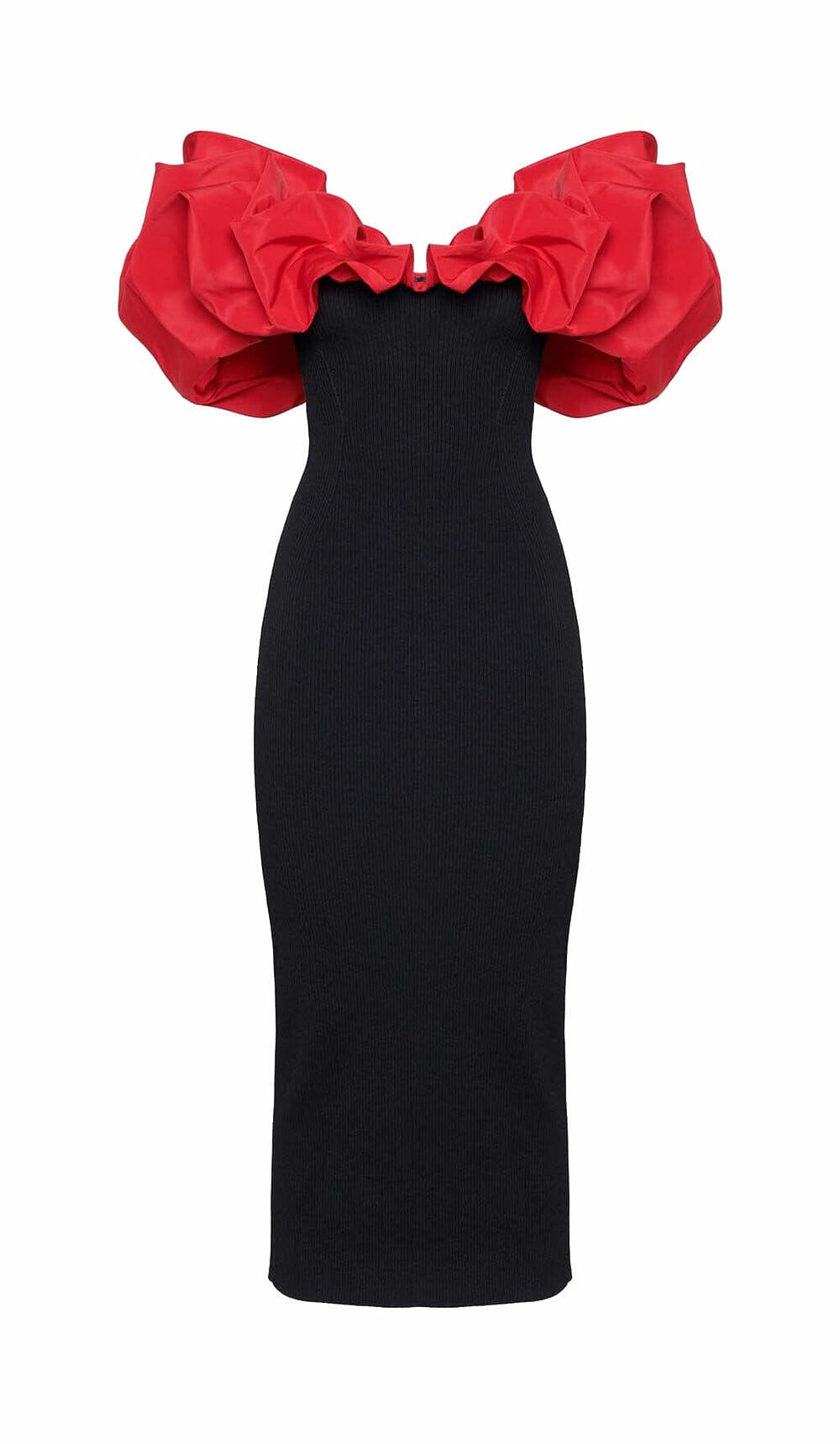 RUFFLED PENCIL MIDI DRESS IN BLACK
