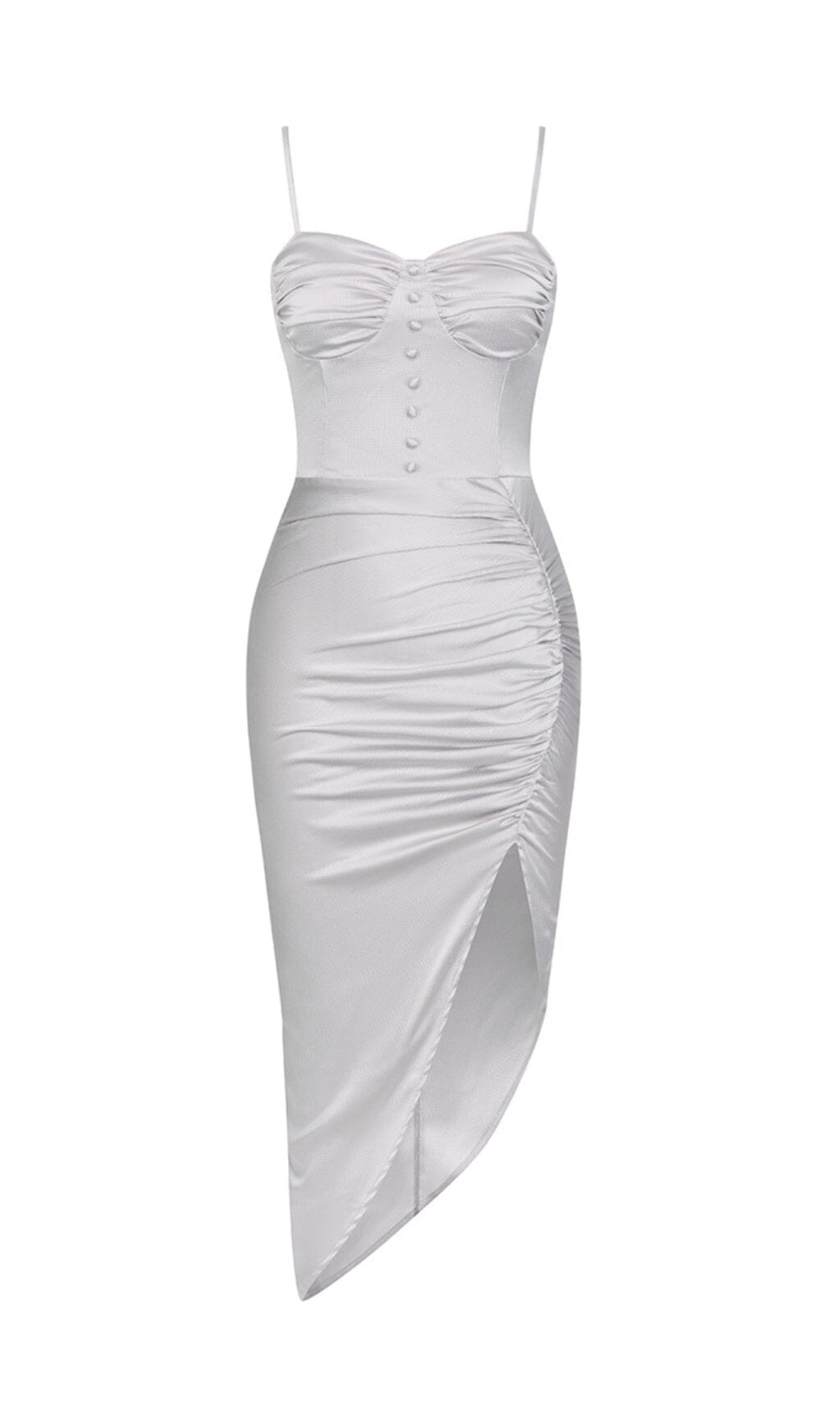 Turn heads in this statement-making grey ruched dress crafted from a luxe satin fabric. Soft and sophisticated. it's sure to give you that sleek. chic look everybody has been raving about! Dare to be different. but still classy.