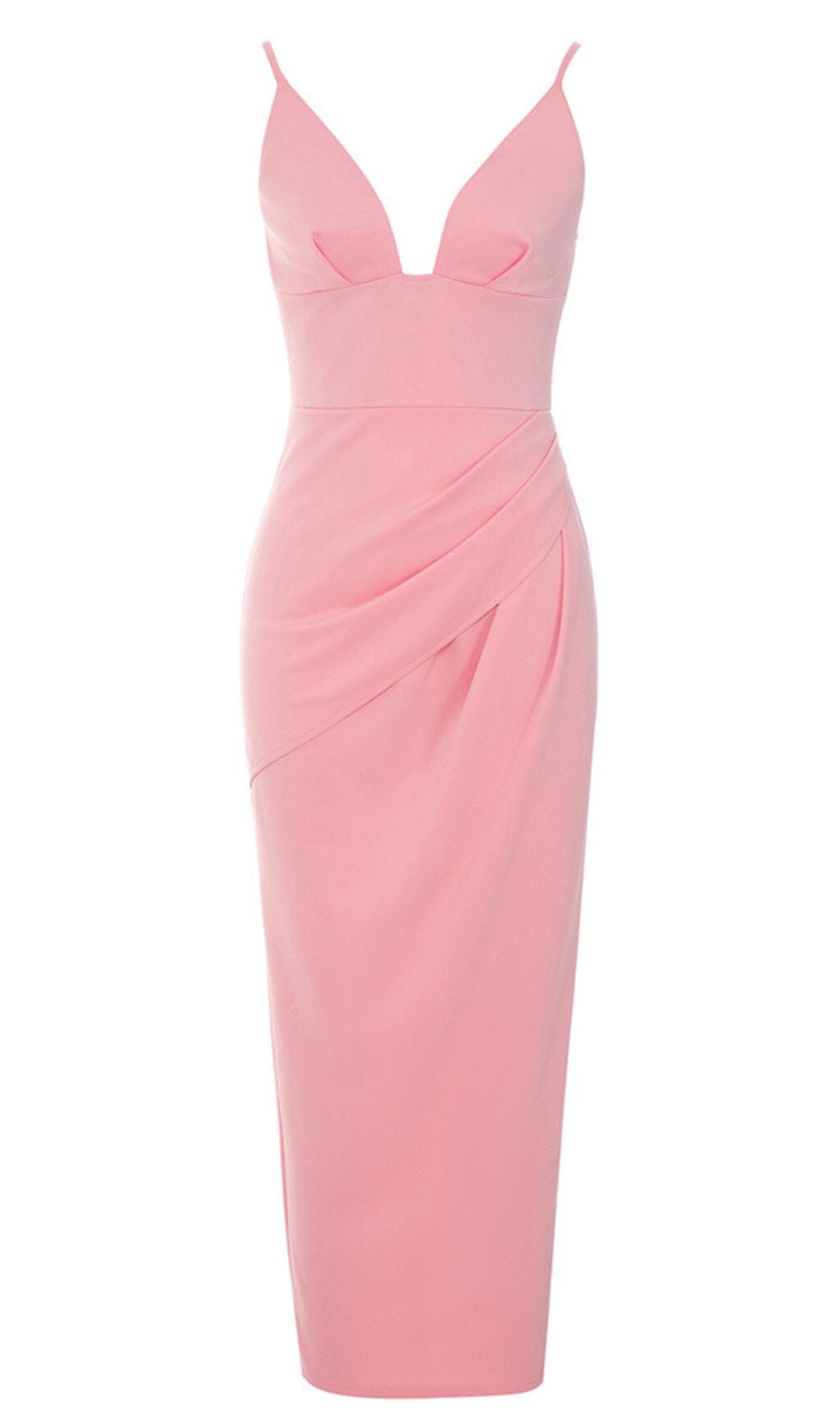 SATIN STRAPY SPLIT MIDI DRESS IN PINK