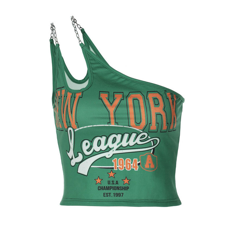 Letter Print Cut Out Chain Trim One Shoulder Crop Top - Green