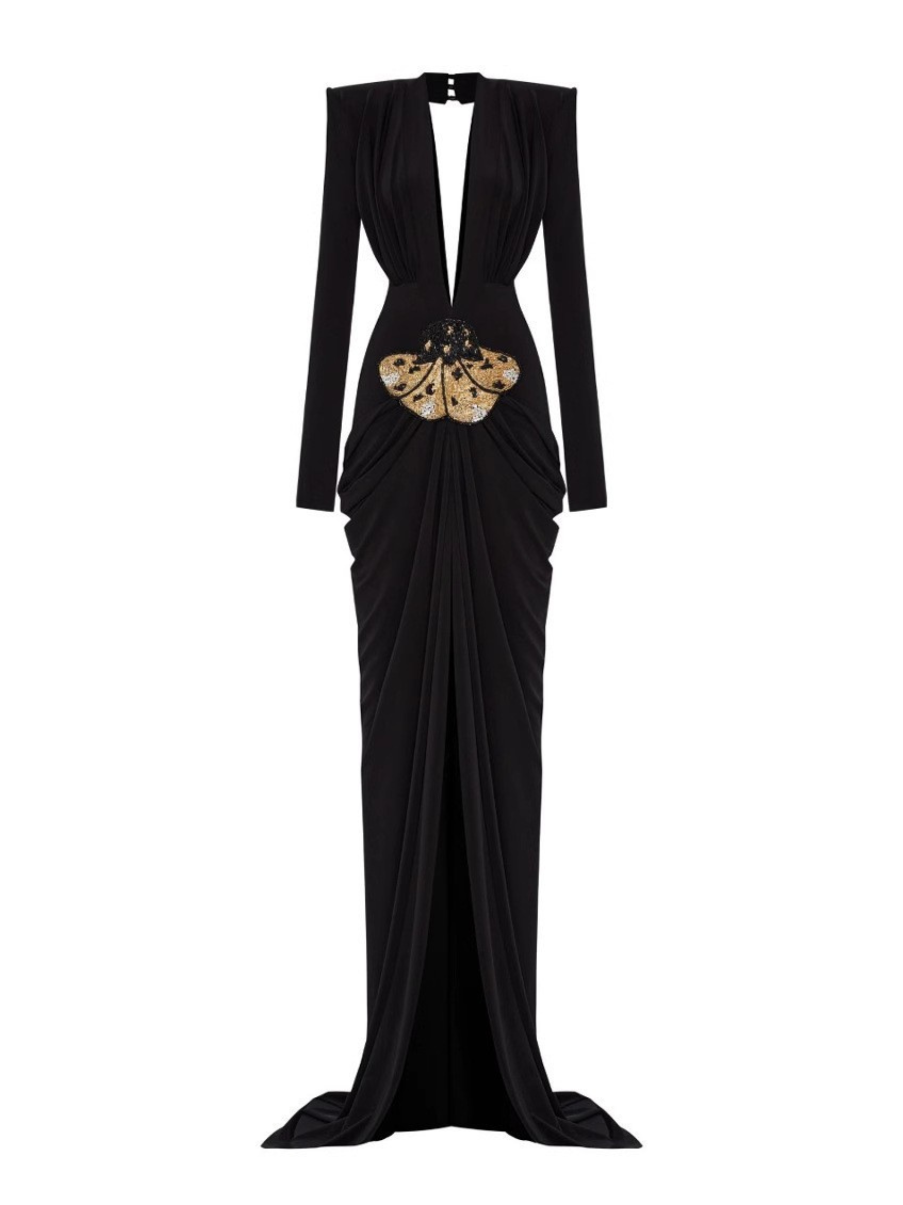 The Sonja Long Sleeve Maxi Dress is a bold statement piece designed for the woman who loves to command attention. This black floor-length gown features a deep plunging neckline that enhances the silhouette. while structured shoulders add a dramatic. high-fashion touch. The ruched detailing at the waist sculpts your figure. and the standout feature—a gold and black sequined butterfly embellishment—adds a luxe. show-stopping element. The long sleeves balance the daring cut. making it a striking choice for upscale events. galas. and red carpet moments.