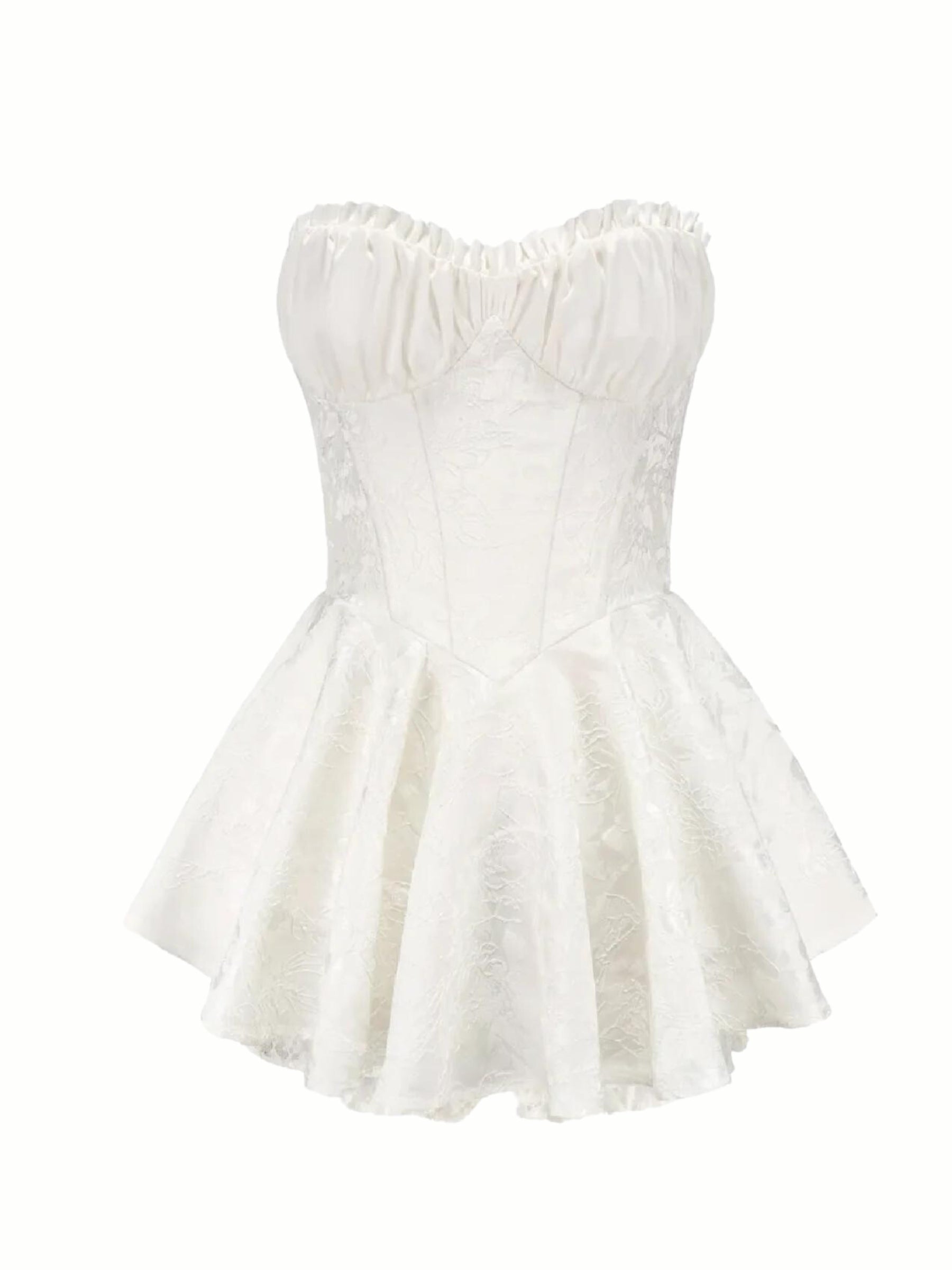 Look like a total dream in our Stassi Dress! This strapless mini gown dress comes in a beautiful pure white color and is complete with a heart neck. ruffle details. high waist skirt. and lace shorts. For the perfect blend of romantic. cute. and sexy. get your hands on this stunning piece from our 'Modern Romance' collection today!