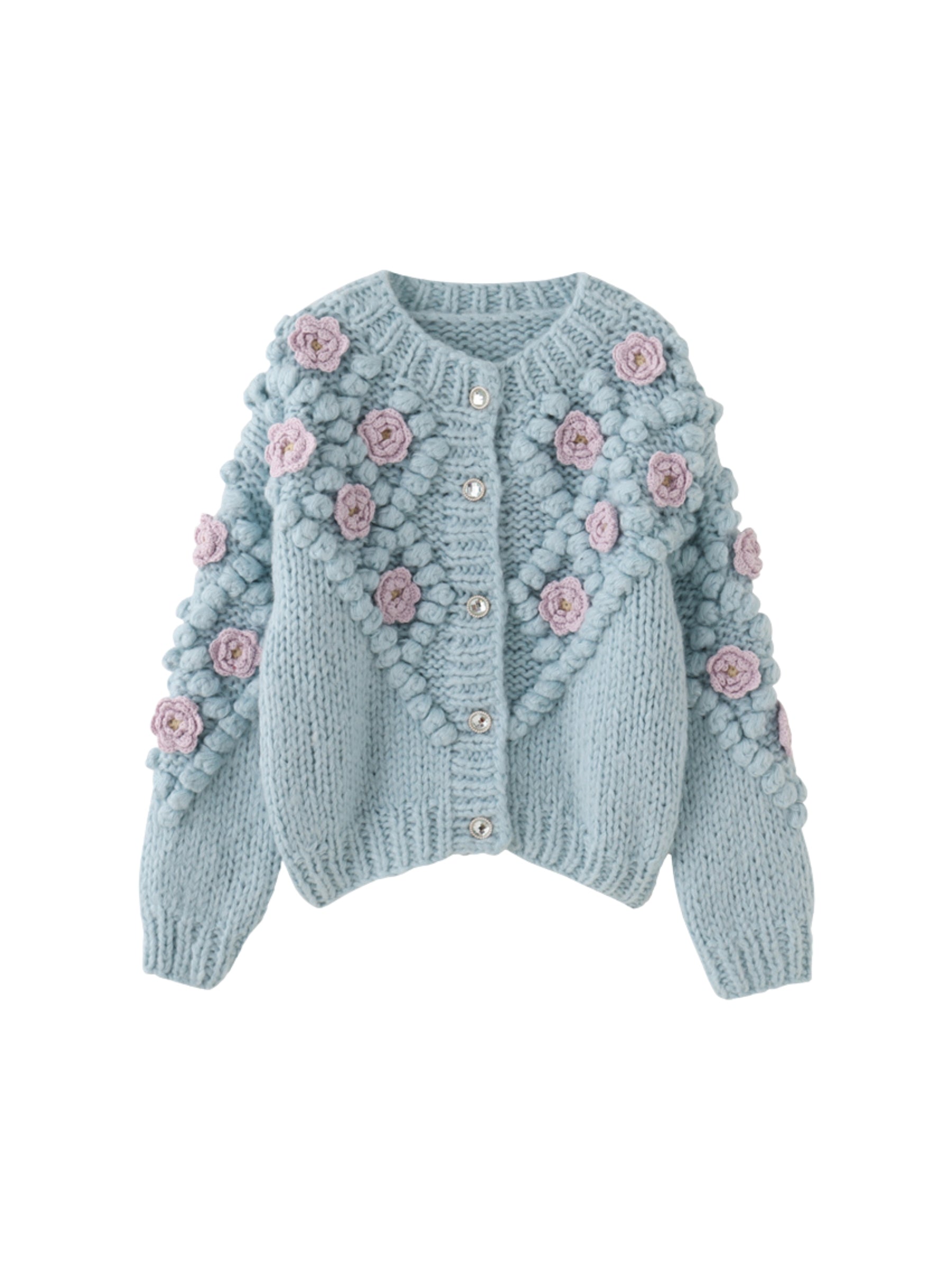 Add a touch of vintage-inspired charm to your wardrobe with our Stormie Floral Cardigan! Handmade with intricate floral embellishments. this cardigan features a soft. pastel blue base and lavender flower accents. The button-up front and pearl-style buttons add a classic touch. Stay cozy and stylish this winter with our Aesvs Collection.