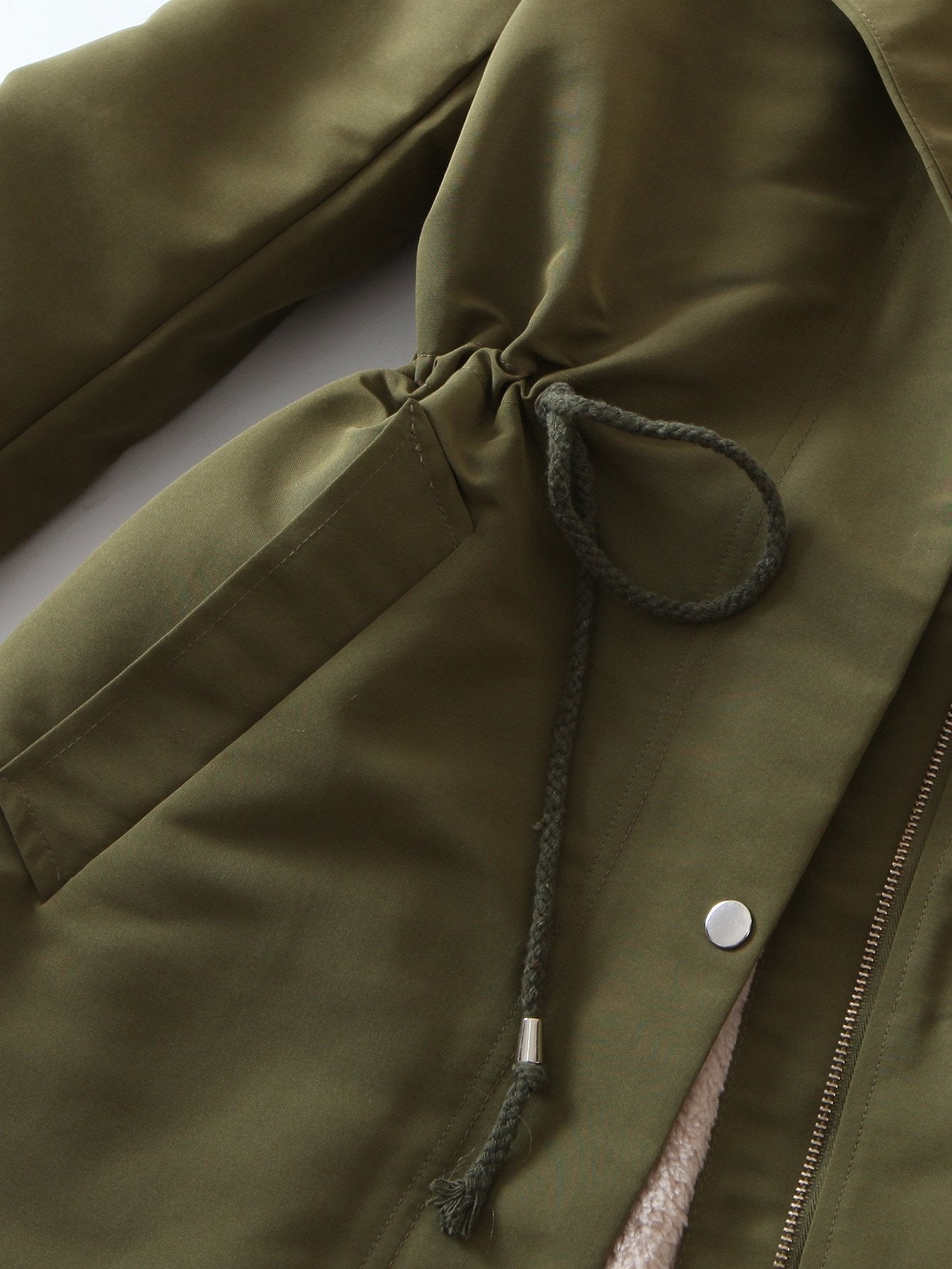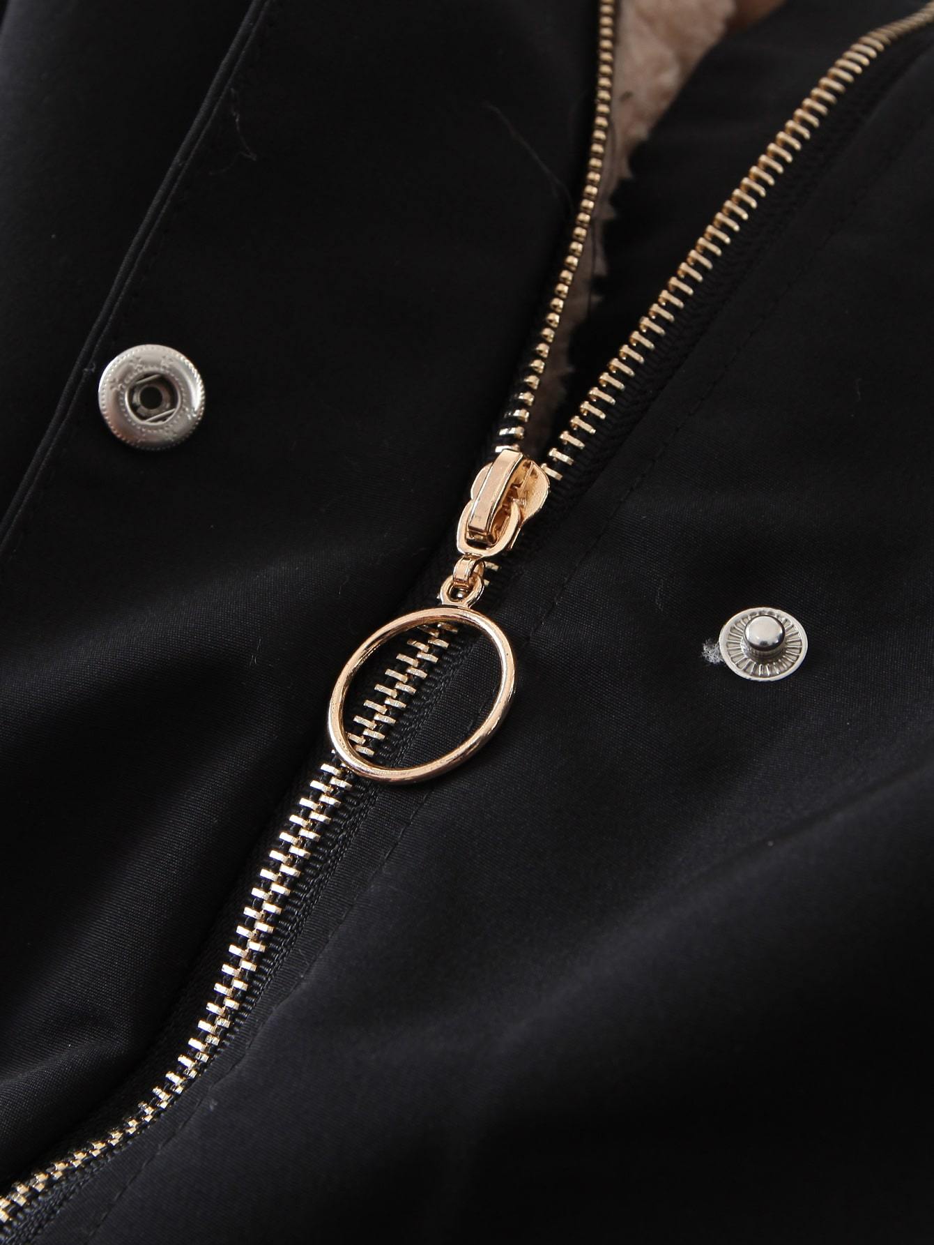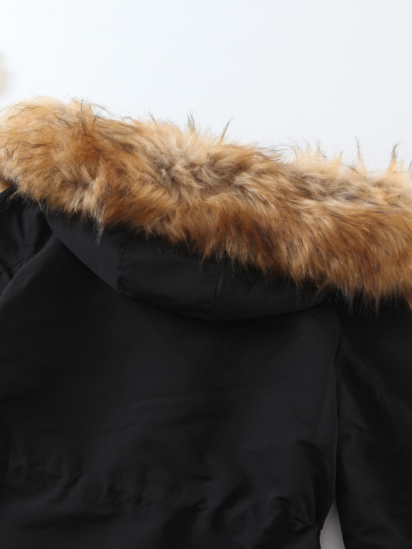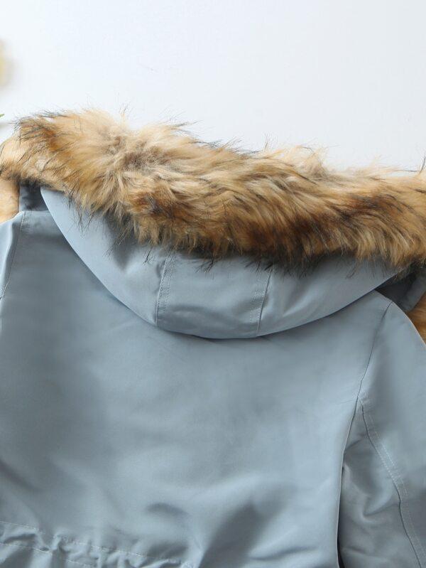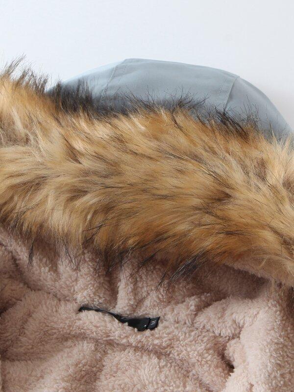 Contrast Faux Fur. Drawstring. Button. Ring. Zipper