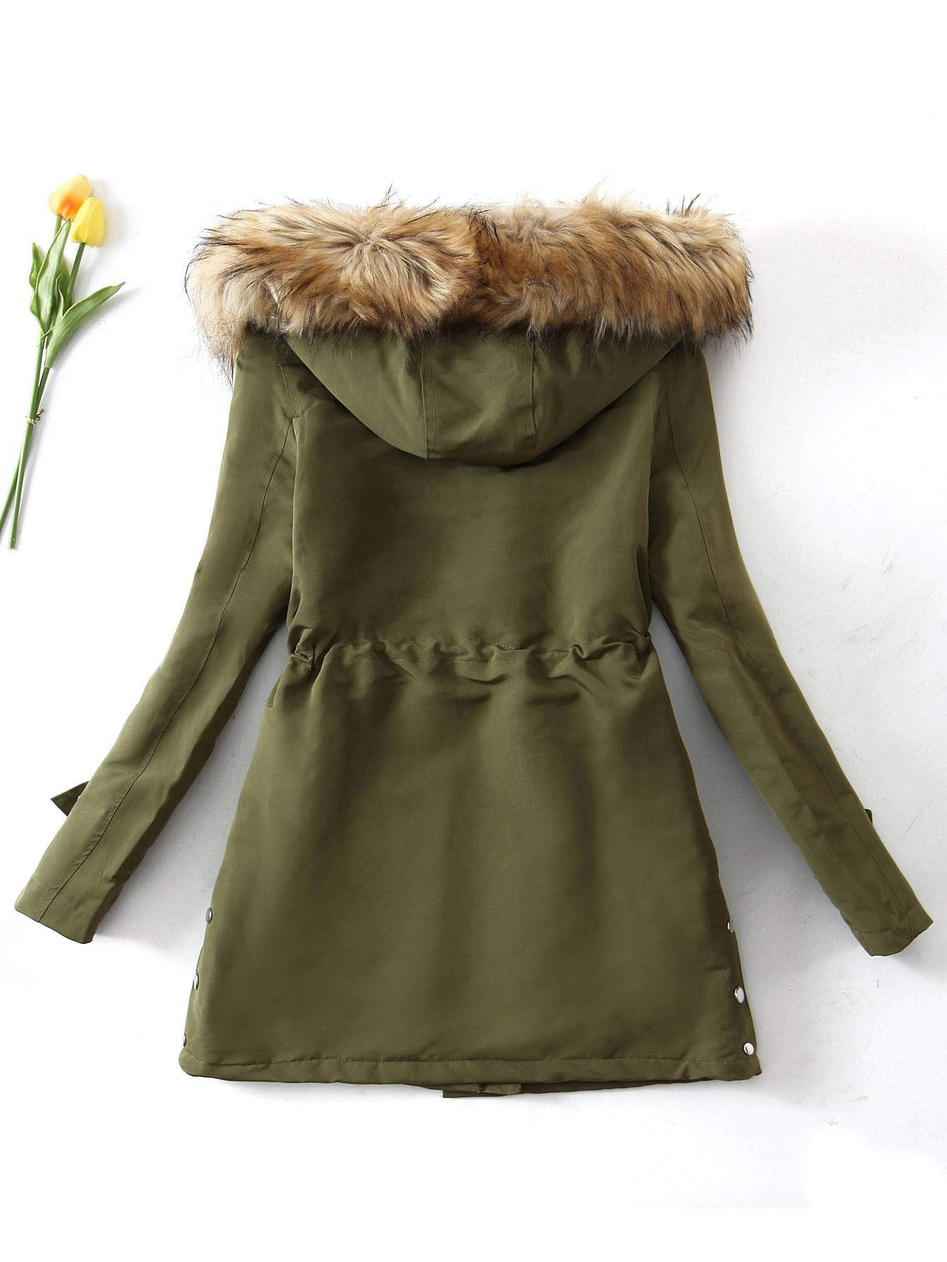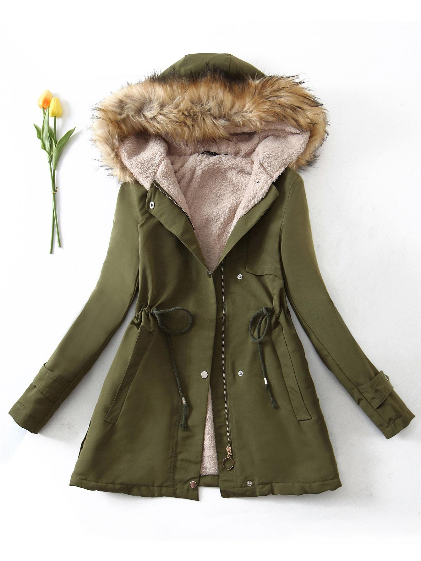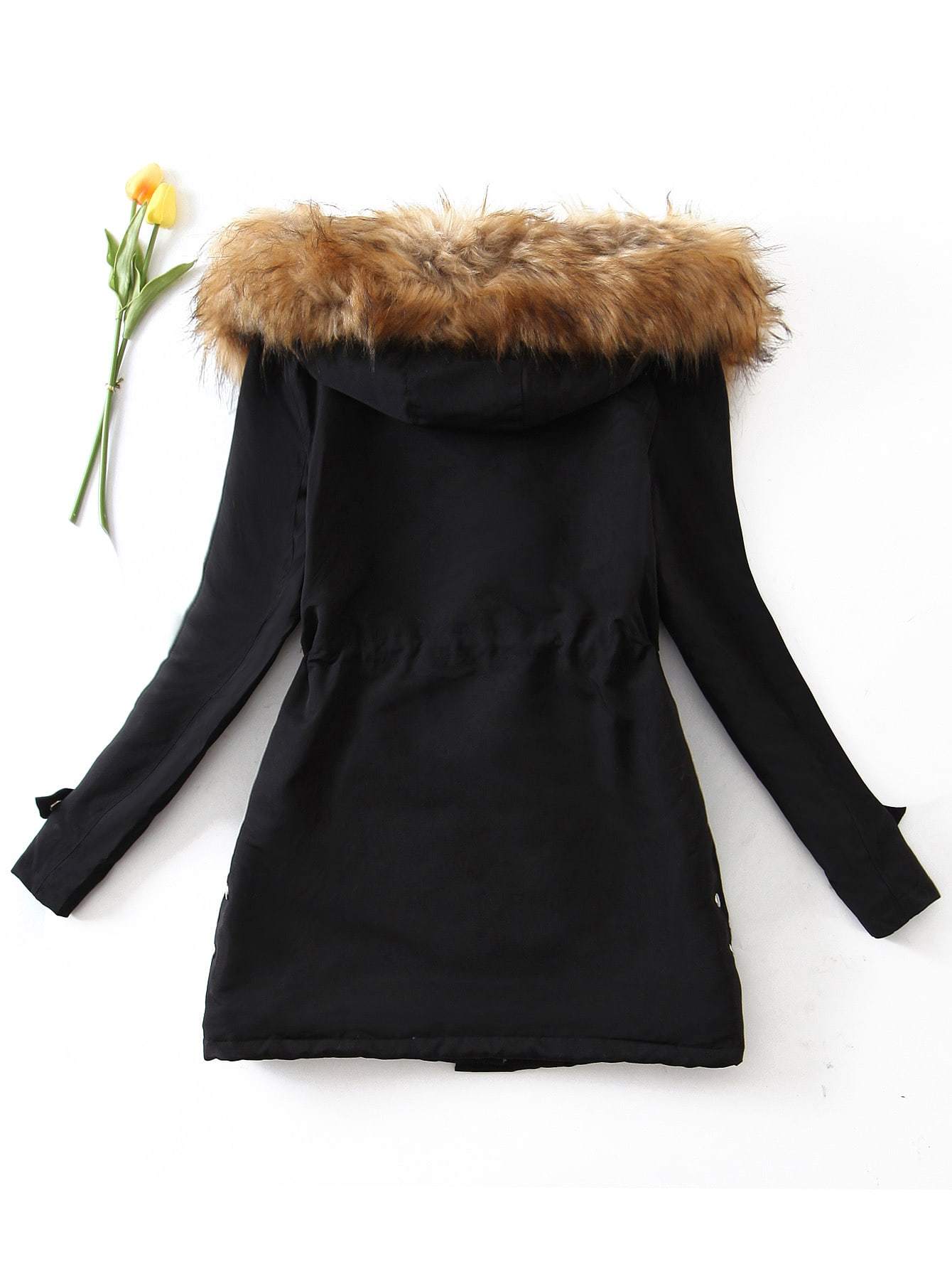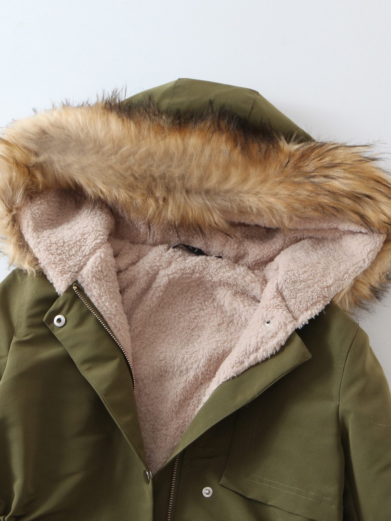 Contrast Faux Fur. Drawstring. Button. Ring. Zipper