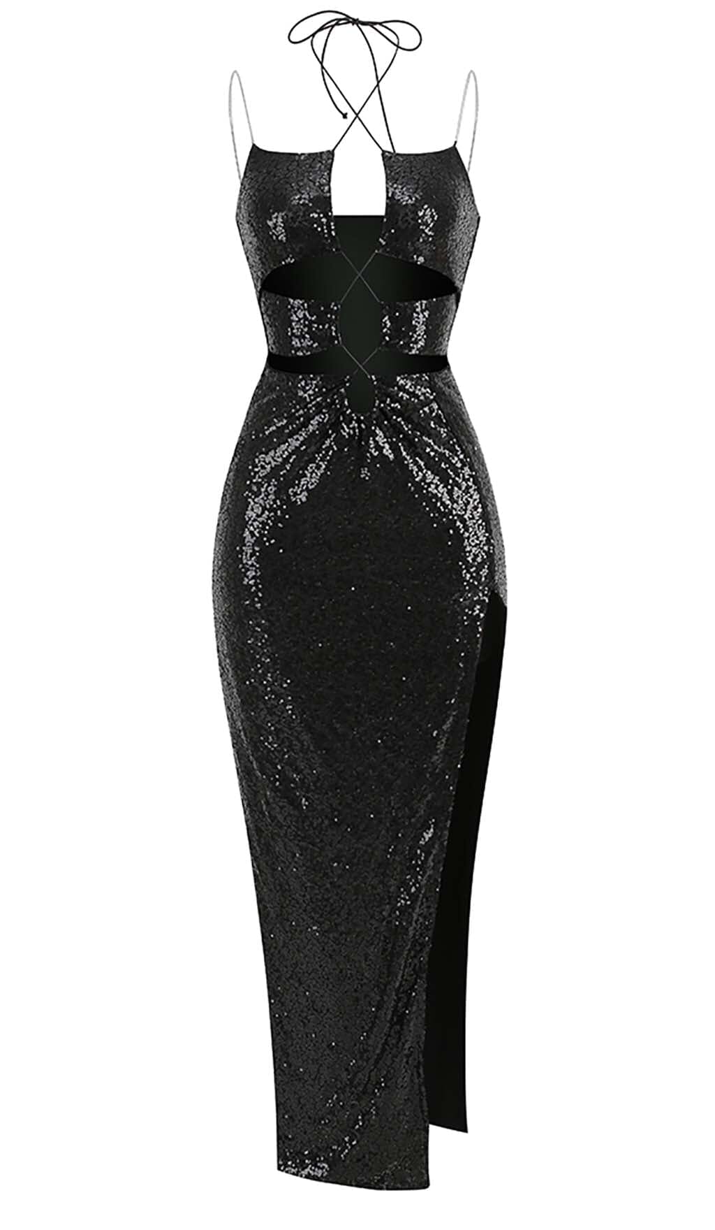 THIGH SLIT SEQUIN MAXI DRESS IN BLACK