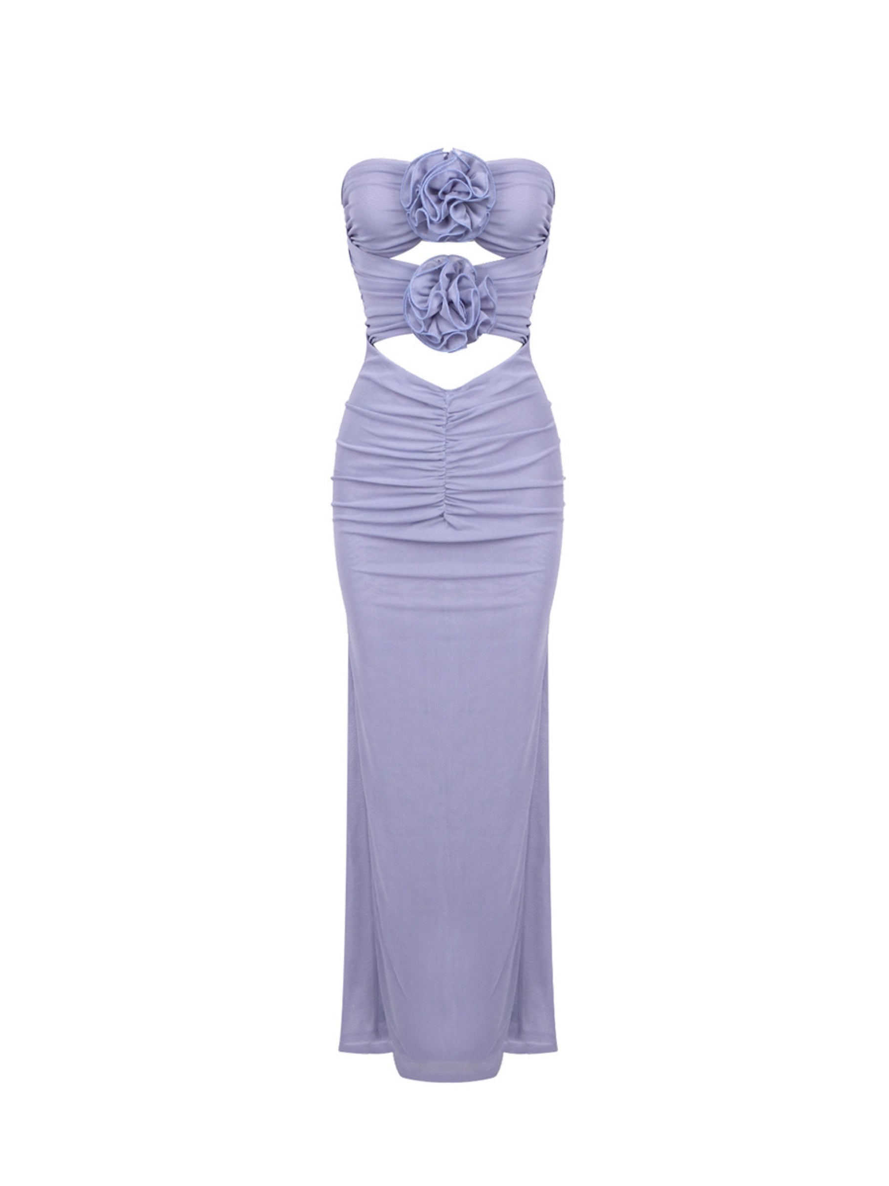Elevate your evening look with the stunning Timber Floral Maxi Dress. This enchanting lilac gown is designed to captivate. featuring a strapless and sleeveless silhouette that exudes elegance and grace. The intricate floral detailing on the bodice adds a touch of romance. while the bold cut-out design at the midriff introduces a modern. alluring twist. Perfectly tailored to hug your curves. this maxi dress flows beautifully to the floor. making it an ideal choice for special occasions or a memorable romantic evening. Whether you're attending a gala or an intimate dinner. the Timber Floral Maxi Dress ensures you stand out with its timeless charm. This exquisite piece is a proud addition to the Aesvs Collection. where sophistication meets contemporary style.