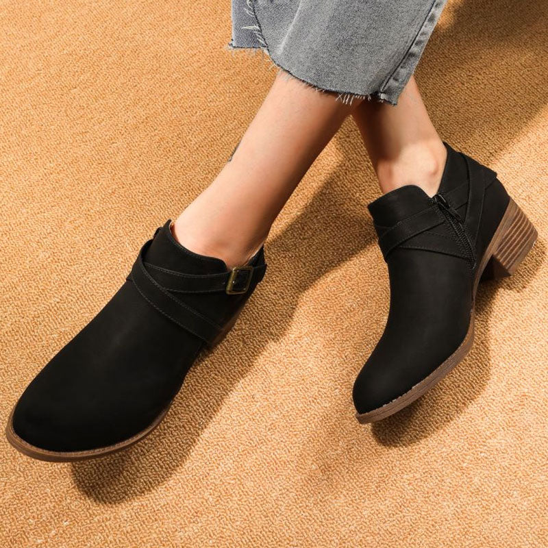 No one does it quite like the retro style strap ankle booties. Crafted with smooth suede and rubber. stand out in crisscross ankle straps accentuated with an antique-style adjustable buckle. featuring a pointed toecap framed by a suede upper. topstitching details. a tonal side zipper closure. a cushioned footbed and a synthetic sole. a mid block heel adorned with wooden-like stripes. Find more trendy women's suede boots and unique shoes in our boutique. and wear them with a nostalgic dress and a long-sleeve blazer - Heel height: 4.5cm.