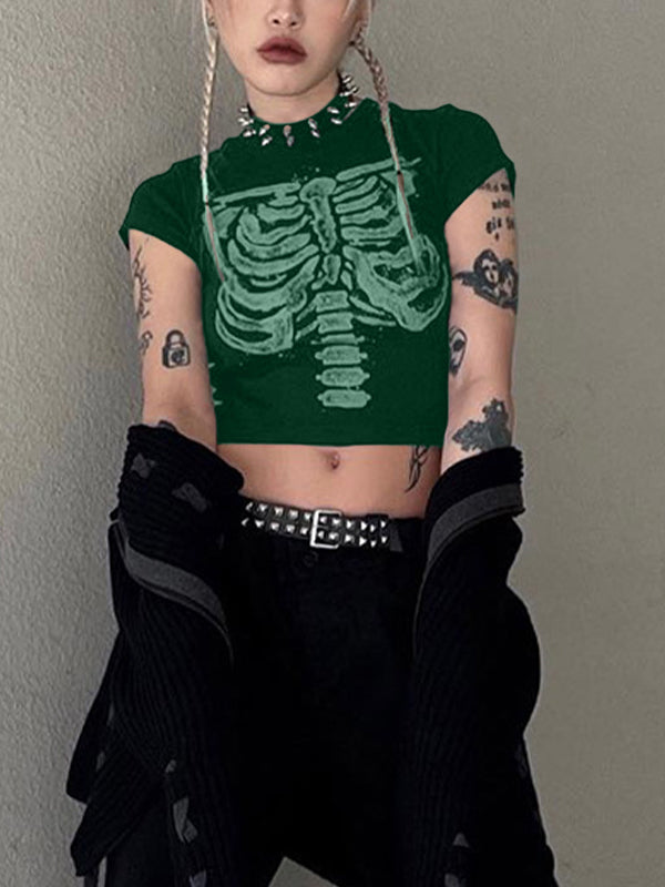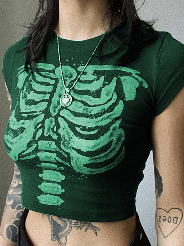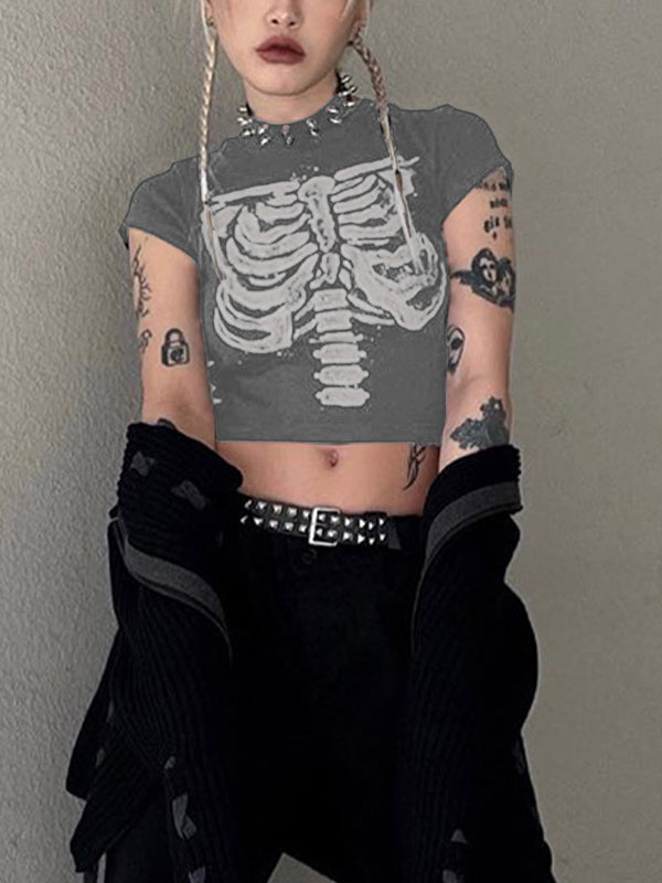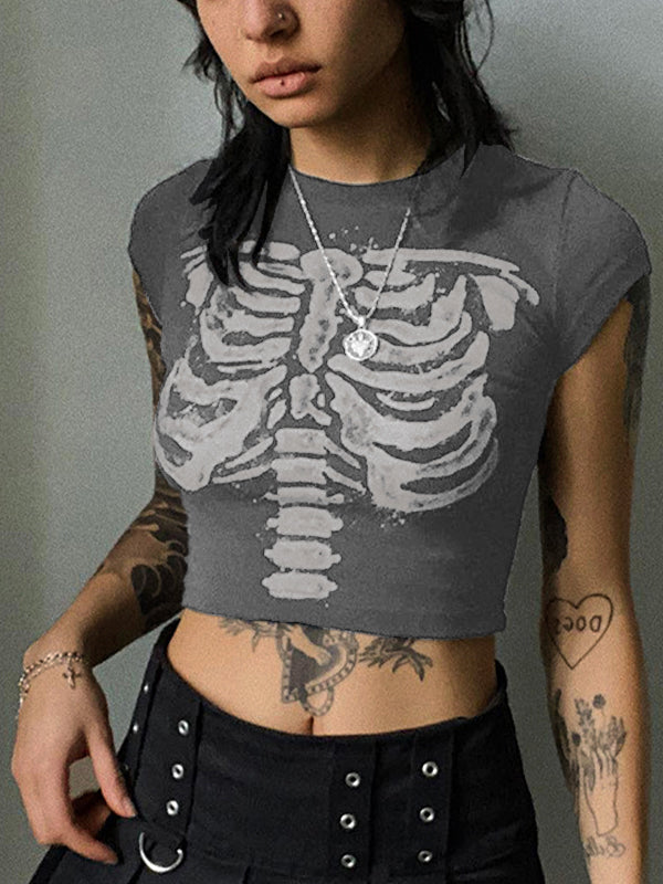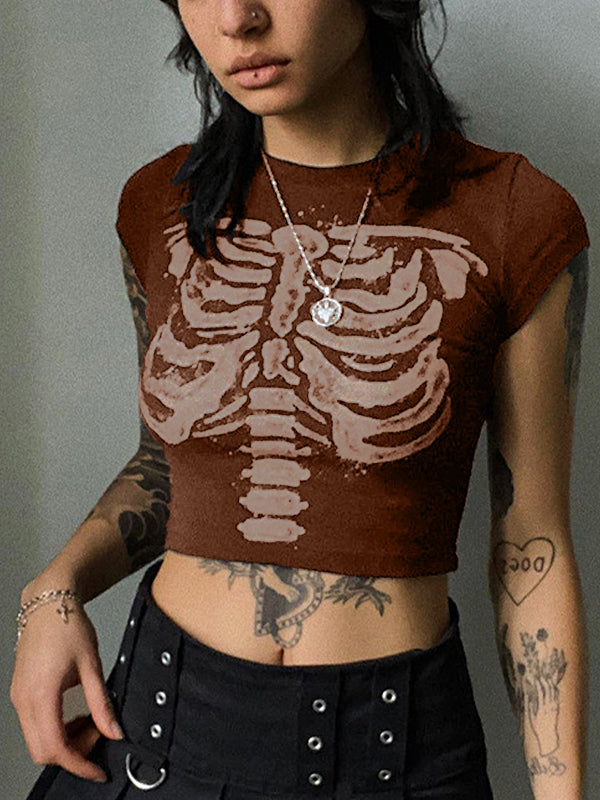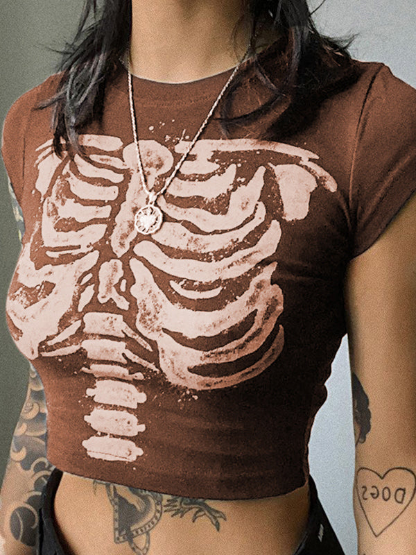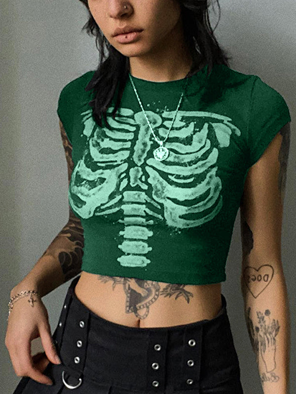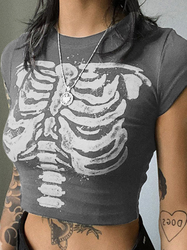 Description: Get some nostalgia y2k baby tees to your summer wardrobe. it's versatile to style and trendy. This crop top has a tightened-cut silhouette. it features short cap sleeves style. and a design of skeleton printed on the front.