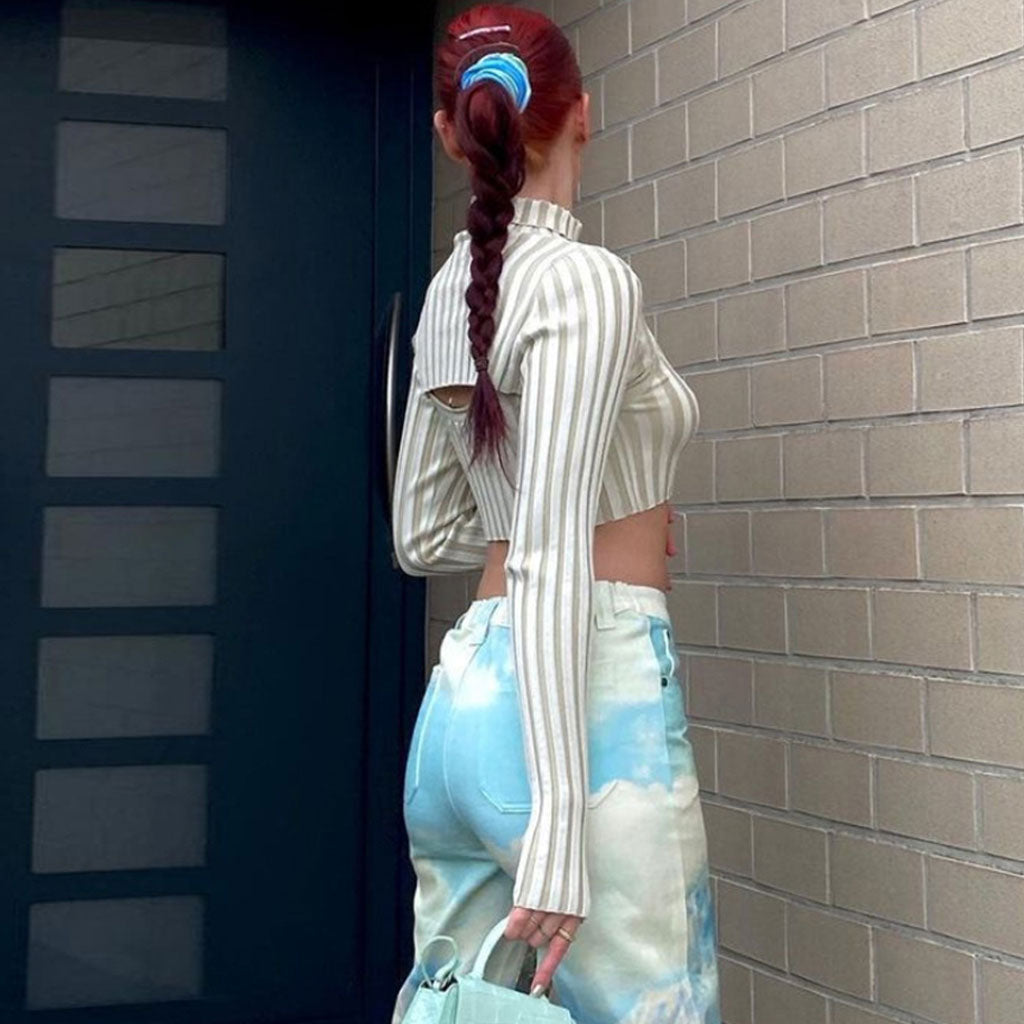 This cardigan matching set is eye-catching and weird. Made of soft ribbed jersey and polyester fabric. stand out in a two-piece profile. featuring a pullover sweater structured with a high collar. long sleeves tailored with thumb holes and a cropped length. matching with a crop tank top trimmed with uneven edges. Find more trendy women's sweaters or clothing in our boutique. and pair it with a matching baguette bag and high rise denim for a unique street look.